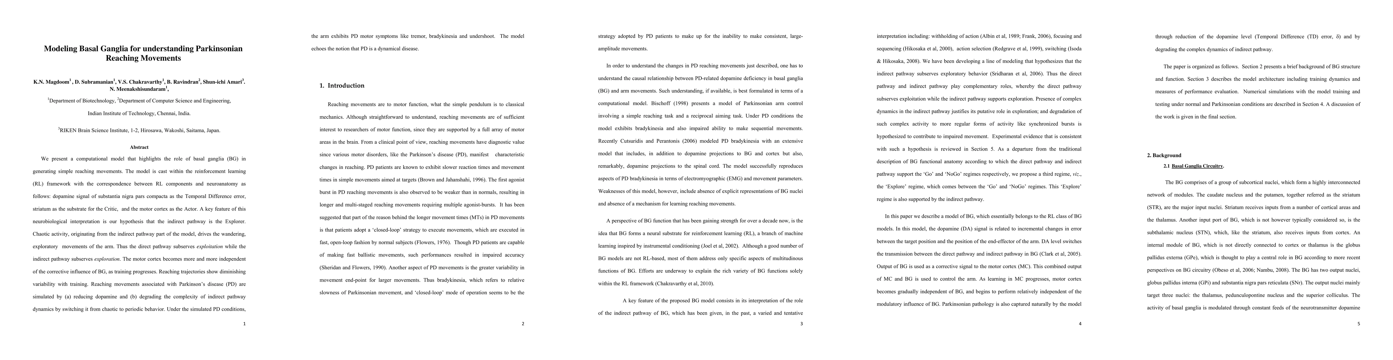 This paper develops a computational model within a reinforcement learning framework to elucidate the basal ganglia's role in Parkinsonian reaching movements. The model simulates Parkinson's disease by reducing dopamine and altering indirect pathway dynamics, replicating symptoms like tremor, bradykinesia, and undershoot.