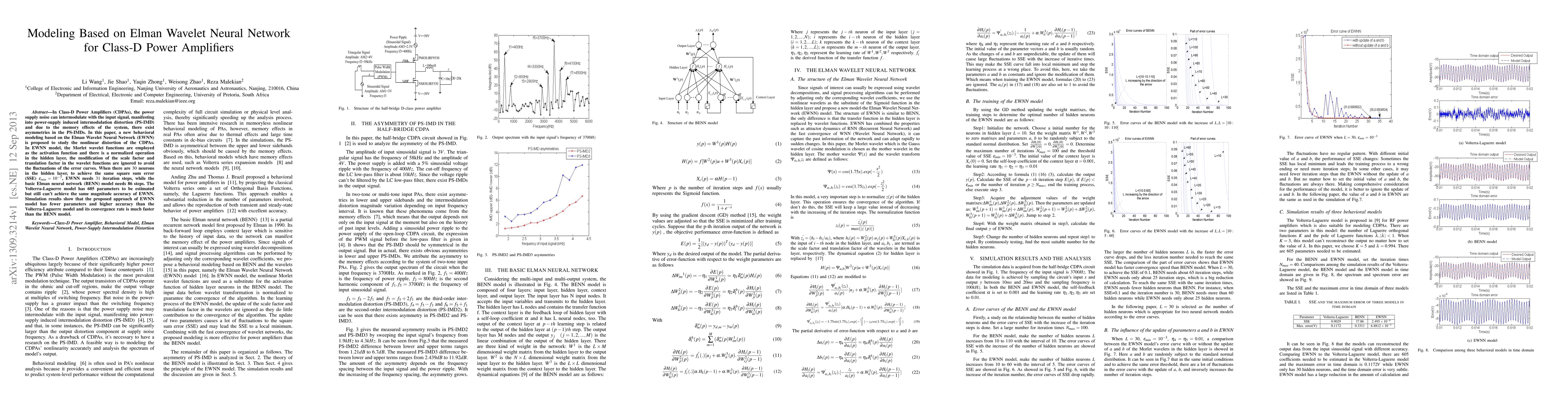 In Class-D Power Amplifiers (CDPAs), the power supply noise can intermodulate with the input signal, manifesting into power-supply induced intermodulation distortion (PS-IMD) and due to the memory effects of the system, there exist asymmetries in the PS-IMDs. In this paper, a new behavioral modeling based on the Elman Wavelet Neural Network (EWNN) is proposed to study the nonlinear distortion of the CDPAs. In EWNN model, the Morlet wavelet functions are employed as the activation function and there is a normalized operation in the hidden layer, the modification of the scale factor and translation factor in the wavelet functions are ignored to avoid the fluctuations of the error curves. When there are 30 neurons in the hidden layer, to achieve the same square sum error (SSE) $\epsilon_{min}=10^{-3}$, EWNN needs 31 iteration steps, while the basic Elman neural network (BENN) model needs 86 steps. The Volterra-Laguerre model has 605 parameters to be estimated but still can't achieve the same magnitude accuracy of EWNN. Simulation results show that the proposed approach of EWNN model has fewer parameters and higher accuracy than the Volterra-Laguerre model and its convergence rate is much faster than the BENN model.