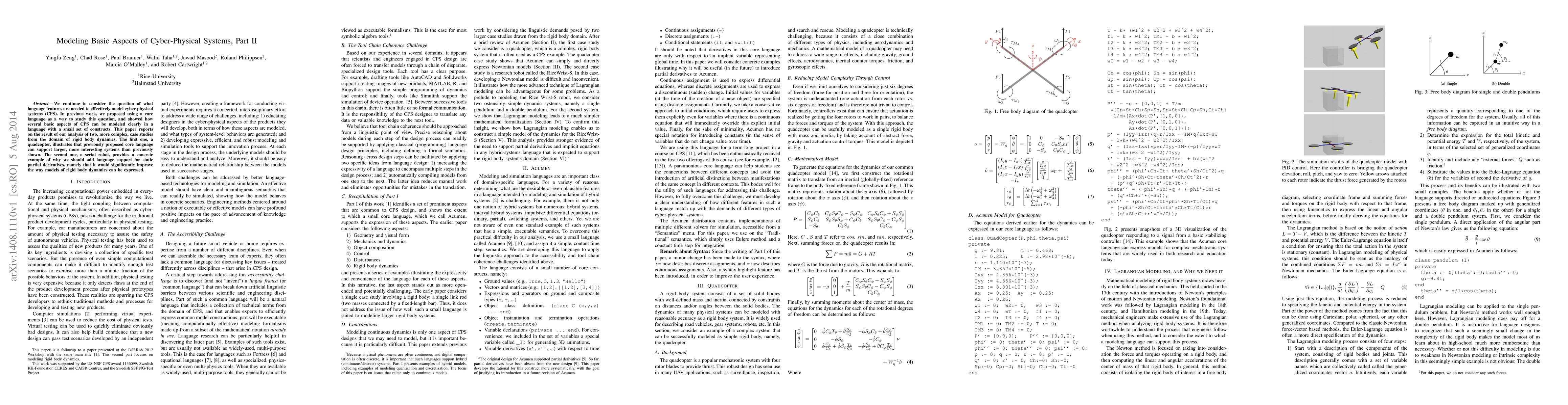 We continue to consider the question of what language features are needed to effectively model cyber-physical systems (CPS). In previous work, we proposed using a core language as a way to study this question, and showed how several basic aspects of CPS can be modeled clearly in a language with a small set of constructs. This paper reports on the result of our analysis of two, more complex, case studies from the domain of rigid body dynamics. The first one, a quadcopter, illustrates that previously proposed core language can support larger, more interesting systems than previously shown. The second one, a serial robot, provides a concrete example of why we should add language support for static partial derivatives, namely that it would significantly improve the way models of rigid body dynamics can be expressed.