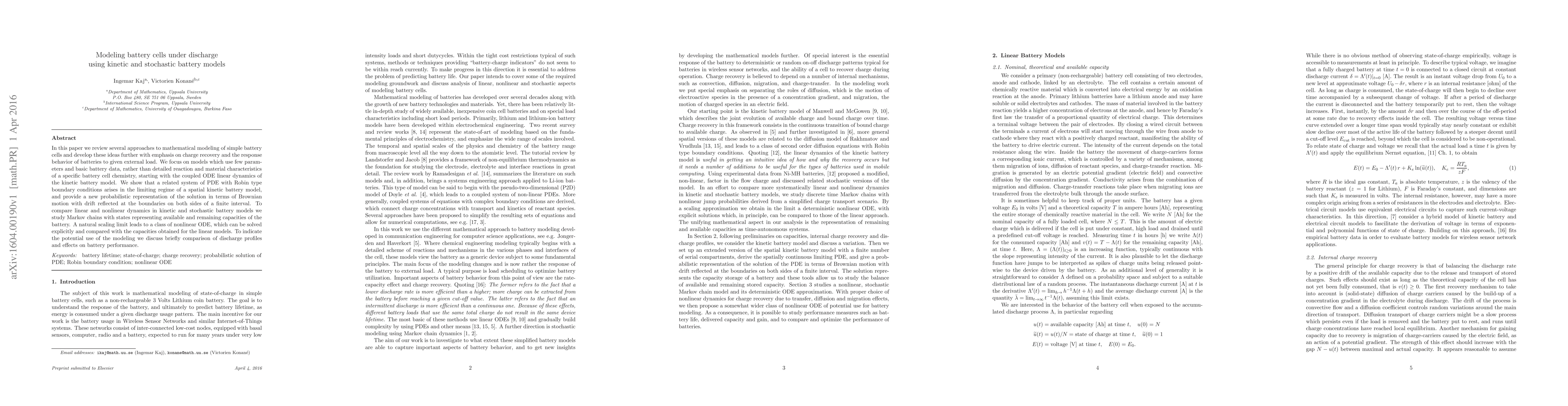 In this paper we review several approaches to mathematical modeling of simple battery cells and develop these ideas further with emphasis on charge recovery and the response behavior of batteries to given external load. We focus on models which use few parameters and basic battery data, rather than detailed reaction and material characteristics of a specific battery cell chemistry, starting with the coupled ODE linear dynamics of the kinetic battery model. We show that a related system of PDE with Robin type boundary conditions arises in the limiting regime of a spatial kinetic battery model, and provide a new probabilistic representation of the solution in terms of Brownian motion with drift reflected at the boundaries on both sides of a finite interval. To compare linear and nonlinear dynamics in kinetic and stochastic battery models we study Markov chains with states representing available and remaining capacities of the battery. A natural scaling limit leads to a class of nonlinear ODE, which can be solved explicitly and compared with the capacities obtained for the linear models. To indicate the potential use of the modeling we discuss briefly comparison of discharge profiles and effects on battery performance.