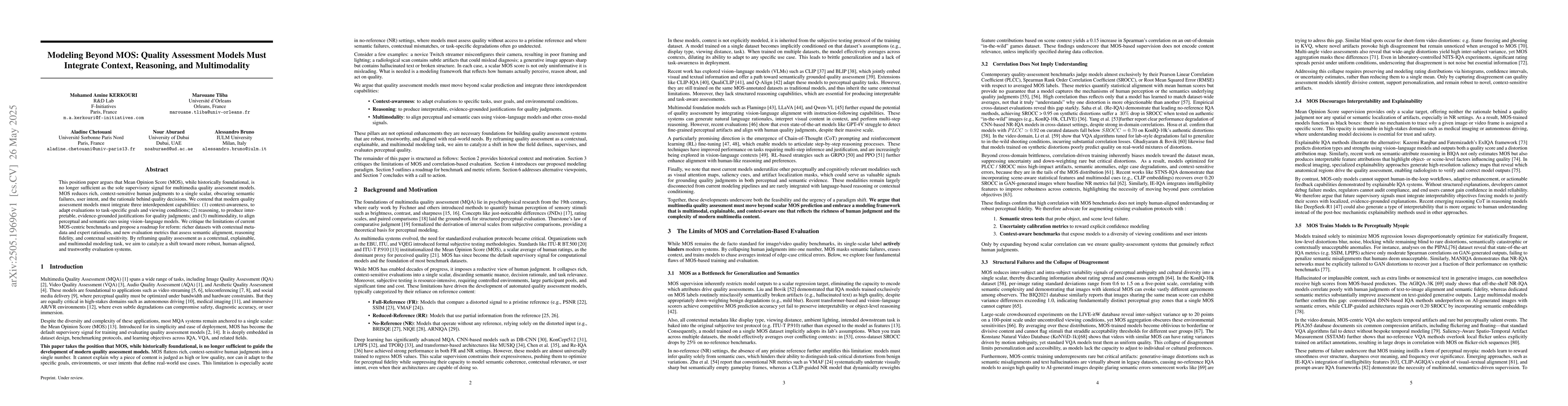 The paper presents a position arguing for the integration of context-awareness, reasoning, and multimodality in quality assessment models, critiquing the limitations of current MOS-centric approaches.