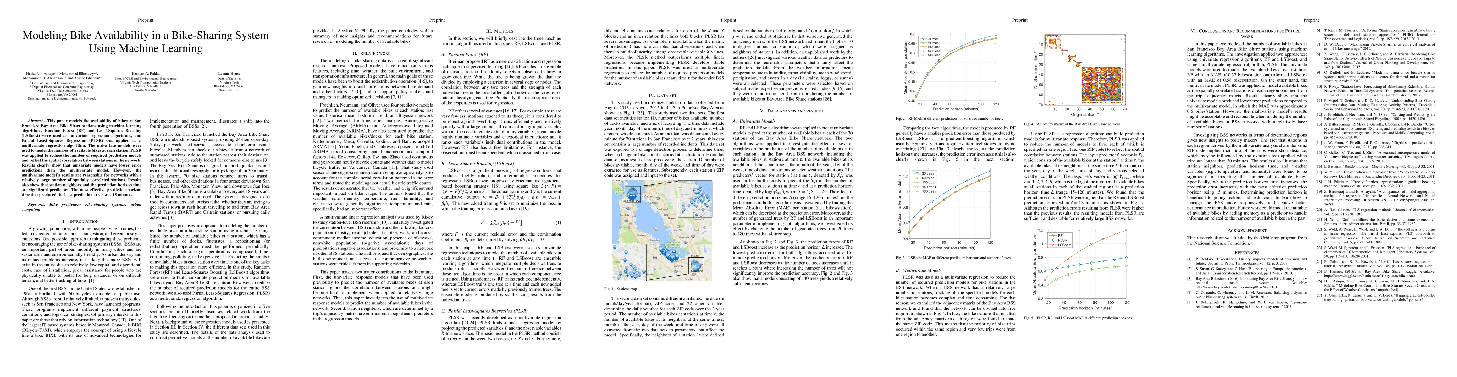 This paper uses machine learning algorithms to predict bike availability in San Francisco Bay Area BikeShare stations, finding that Random Forest and Least-Squares Boosting outperform Partial Least-Squares Regression, with 15 minutes being the optimal prediction horizon. Multivariate modeling is effective for large, spatially correlated networks.