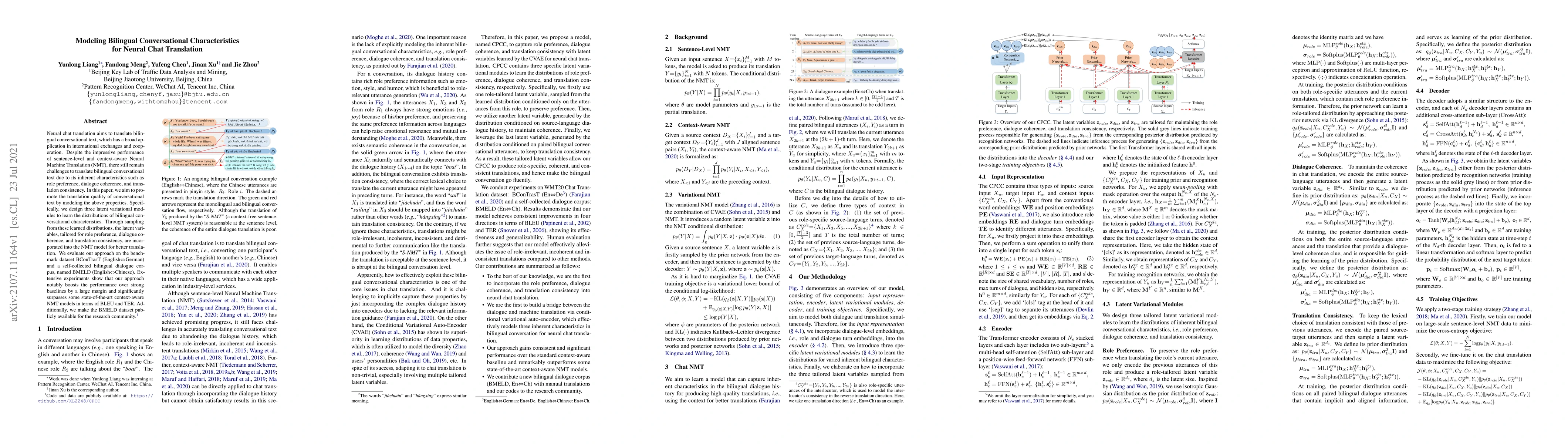 This paper proposes a method to enhance the translation quality of bilingual conversational text by incorporating role preference, dialogue coherence, and translation consistency through latent variational modules. The approach improves upon existing Neural Machine Translation models, demonstrating significant performance gains on benchmark datasets.