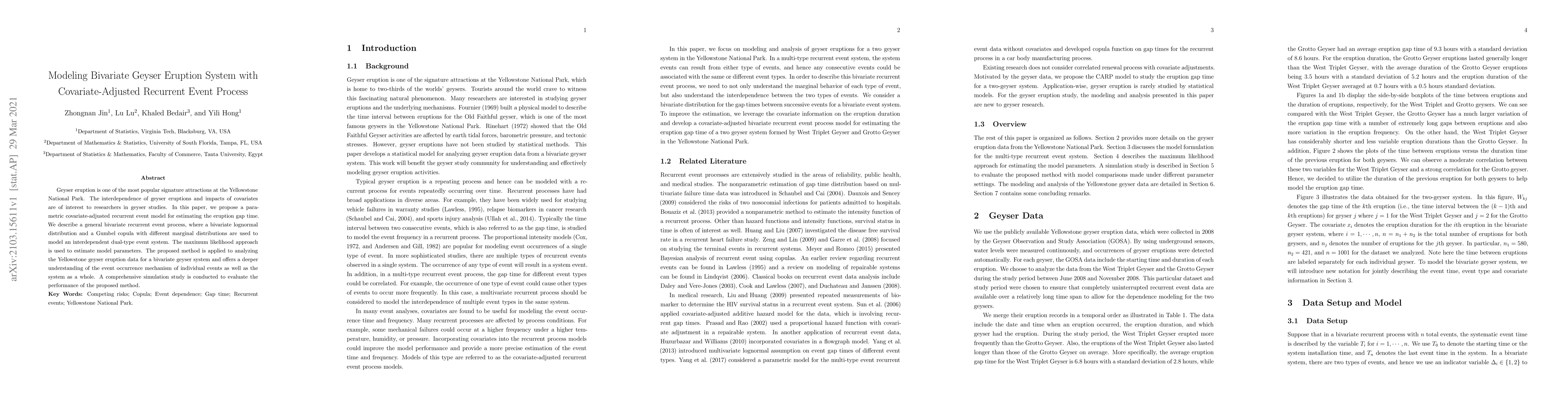 Geyser eruption is one of the most popular signature attractions at the Yellowstone National Park. The interdependence of geyser eruptions and impacts of covariates are of interest to researchers in geyser studies. In this paper, we propose a parametric covariate-adjusted recurrent event model for estimating the eruption gap time. We describe a general bivariate recurrent event process, where a bivariate lognormal distribution and a Gumbel copula with different marginal distributions are used to model an interdependent dual-type event system. The maximum likelihood approach is used to estimate model parameters. The proposed method is applied to analyzing the Yellowstone geyser eruption data for a bivariate geyser system and offers a deeper understanding of the event occurrence mechanism of individual events as well as the system as a whole. A comprehensive simulation study is conducted to evaluate the performance of the proposed method.