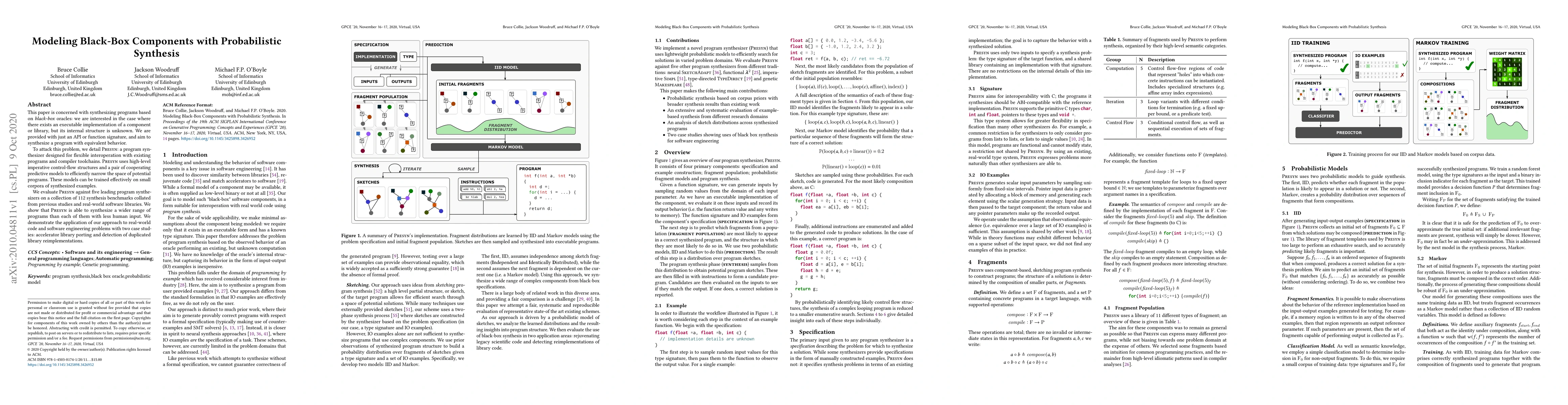 This paper is concerned with synthesizing programs based on black-box oracles: we are interested in the case where there exists an executable implementation of a component or library, but its internal structure is unknown. We are provided with just an API or function signature, and aim to synthesize a program with equivalent behavior. To attack this problem, we detail Presyn: a program synthesizer designed for flexible interoperation with existing programs and compiler toolchains. Presyn uses high-level imperative control-flow structures and a pair of cooperating predictive models to efficiently narrow the space of potential programs. These models can be trained effectively on small corpora of synthesized examples. We evaluate Presyn against five leading program synthesizers on a collection of 112 synthesis benchmarks collated from previous studies and real-world software libraries. We show that Presyn is able to synthesize a wider range of programs than each of them with less human input. We demonstrate the application of our approach to real-world code and software engineering problems with two case studies: accelerator library porting and detection of duplicated library reimplementations.