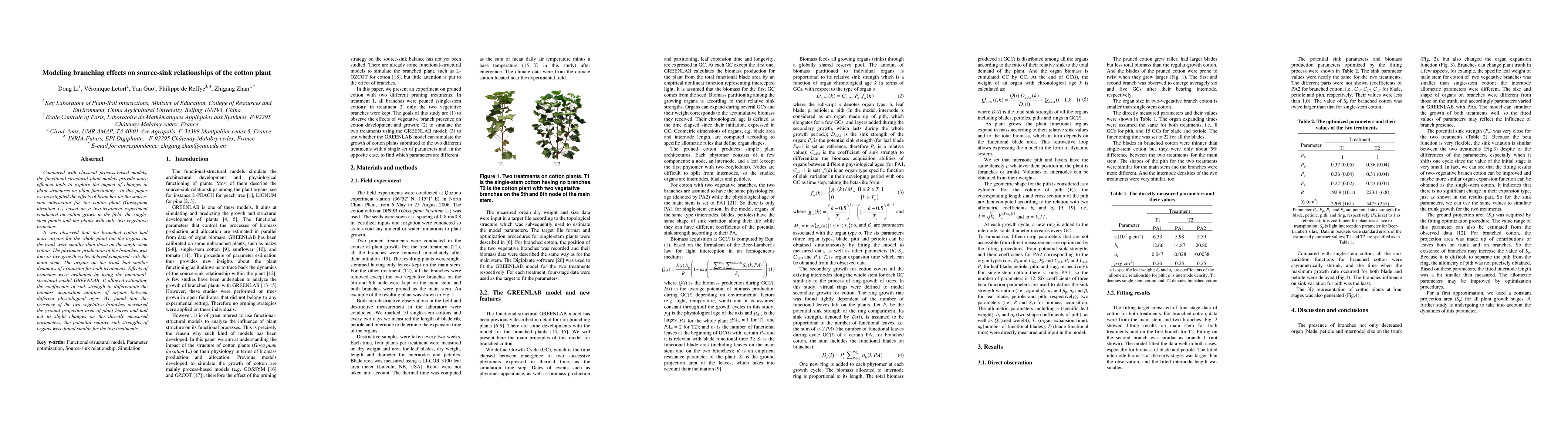 Compared with classical process-based models, the functional-structural plant models provide more efficient tools to explore the impact of changes in plant structures on plant functioning. In this paper we investigated the effects of branches on the sourcesink interaction for the cotton plant (Gossypium hirsutum L.) based on a two-treatment experiment conducted on cotton grown in the field: the singlestem plants and the plants with only two vegetative branches. It was observed that the branched cotton had more organs for the whole plant but the organs on the trunk were smaller than those on the single-stem cotton. The phytomer production of the branches was four or five growth cycles delayed compared with the main stem. The organs on the trunk had similar dynamics of expansion for both treatments. Effects of branches were evaluated by using the functionalstructural model GREENLAB. It allowed estimating the coefficients of sink strength to differentiate the biomass acquisition abilities of organs between different physiological ages. We found that the presence of the two vegetative branches increased the ground projection area of plant leaves and had led to slight changes on the directly measured parameters; the potential relative sink strengths of organs were found similar for the two treatments.