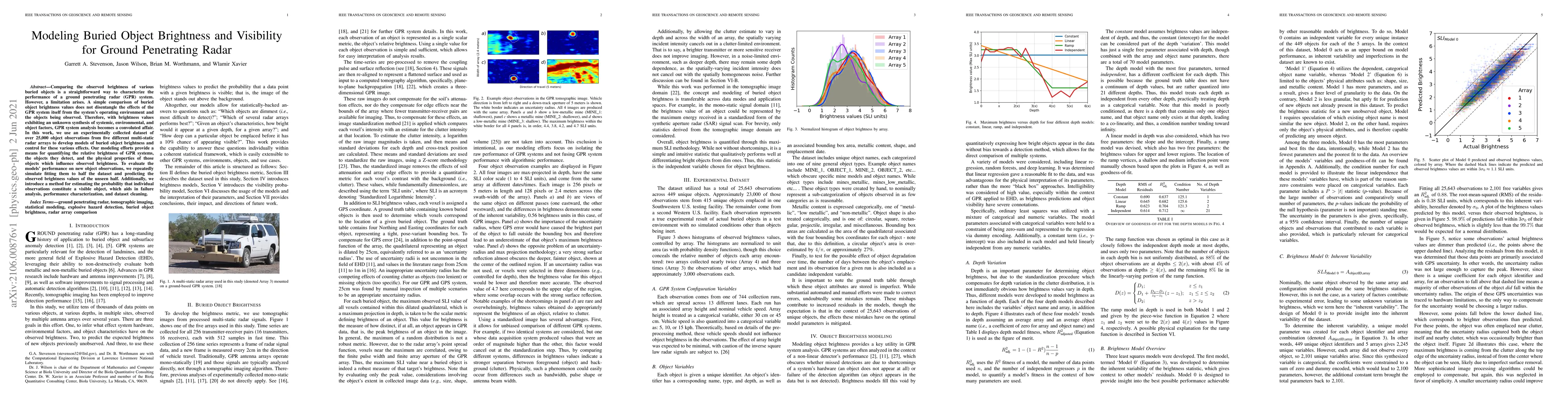 This paper develops models to disentangle the factors affecting buried object brightness in ground penetrating radar (GPR) systems, using a dataset of over 25,000 observations. The models enable quantification of GPR system performance, object visibility, and the physical properties influencing brightness, with performance evaluated through cross-validation and a method for estimating observation visibility.