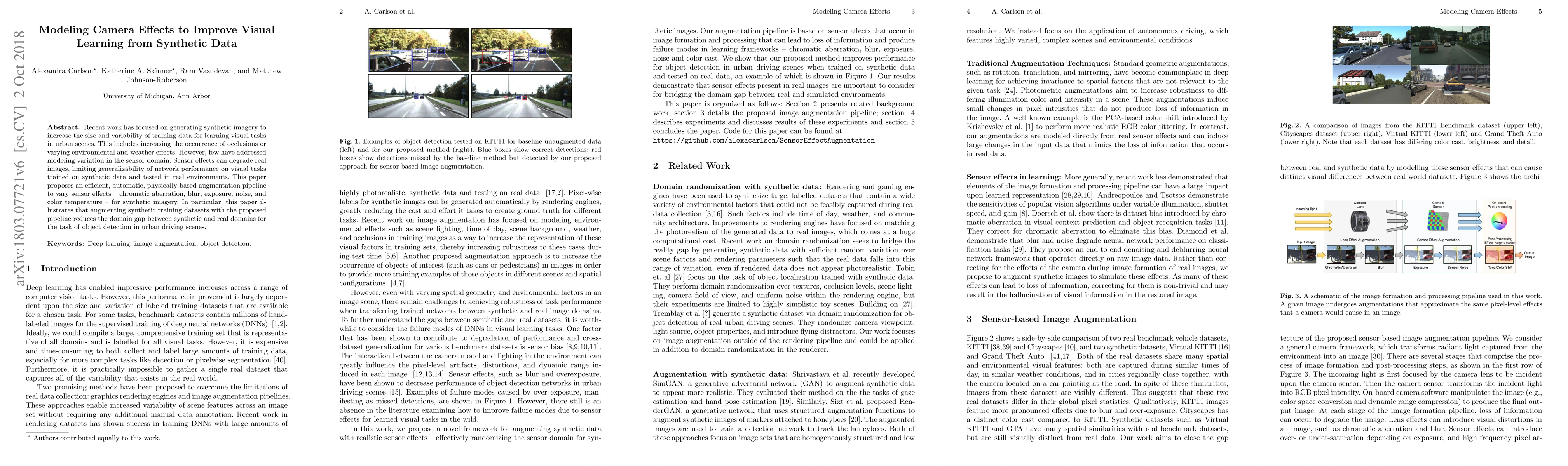 A new method models camera effects to improve learning from synthetic data, reducing domain gap between real and synthetic images. This reduces the performance limitations when training on synthetic data in real-world environments for tasks like object detection.
