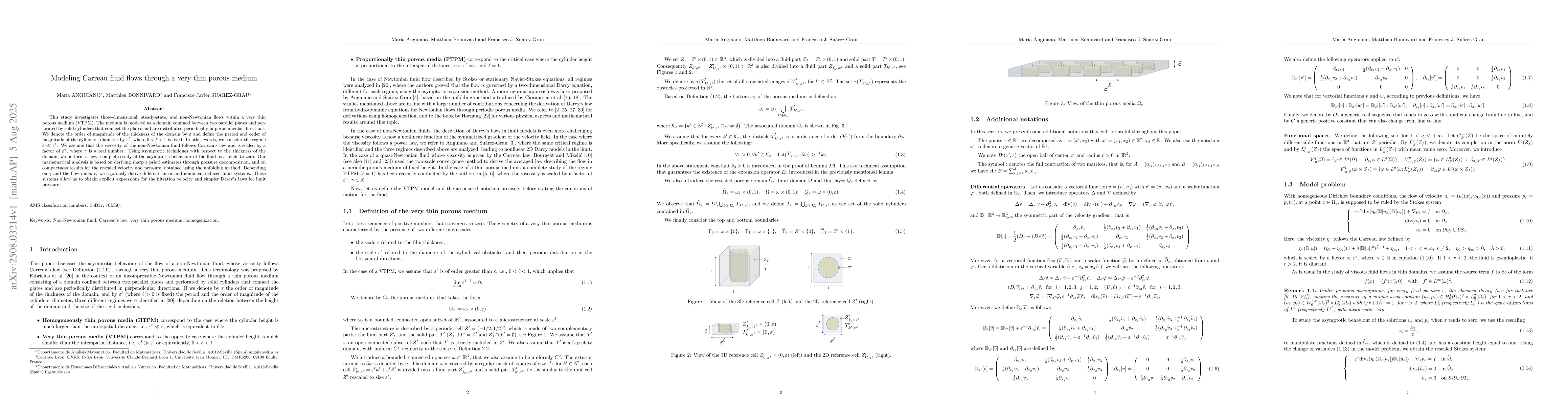 This study investigates three-dimensional, steady-state, and non-Newtonian flows within a very thin porous medium (VTPM). The medium is modeled as a domain confined between two parallel plates and perforated by solid cylinders that connect the plates and are distributed periodically in perpendicular directions. We denote the order of magnitude of the thickness of the domain by $\epsilon$ and define the period and order of magnitude of the cylinders' diameter by $\epsilon$^l, where 0 < l < 1 is fixed. In other words, we consider the regime $\epsilon$ $\ll$ $\epsilon$^l. We assume that the viscosity of the non-Newtonian fluid follows Carreau's law and is scaled by a factor of $\epsilon$^$\gamma$, where $\gamma$ is a real number. Using asymptotic techniques with respect to the thickness of the domain, we perform a new, complete study of the asymptotic behaviour of the fluid as $\epsilon$ tends to zero. Our mathematical analysis is based on deriving sharp a priori estimates through pressure decomposition, and on compactness results for the rescaled velocity and pressure, obtained using the unfolding method. Depending on $\gamma$ and the flow index r, we rigorously derive different linear and nonlinear reduced limit systems. These systems allow us to obtain explicit expressions for the filtration velocity and simpler Darcy's laws for limit pressure.