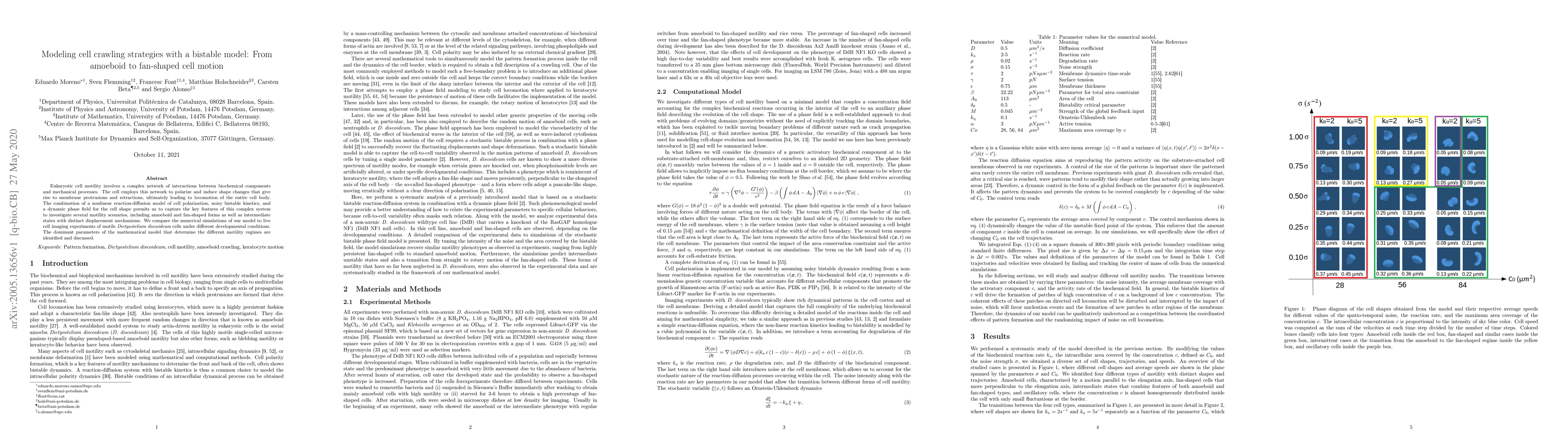This paper models eukaryotic cell motility using a combination of reaction-diffusion, bistable kinetics, and dynamic phase fields to simulate amoeboid and fan-shaped cell crawling. The model's parameters are analyzed to identify key factors influencing different motility regimes, validated through comparison with live cell imaging data of {\it Dictyostelium discoideum}.