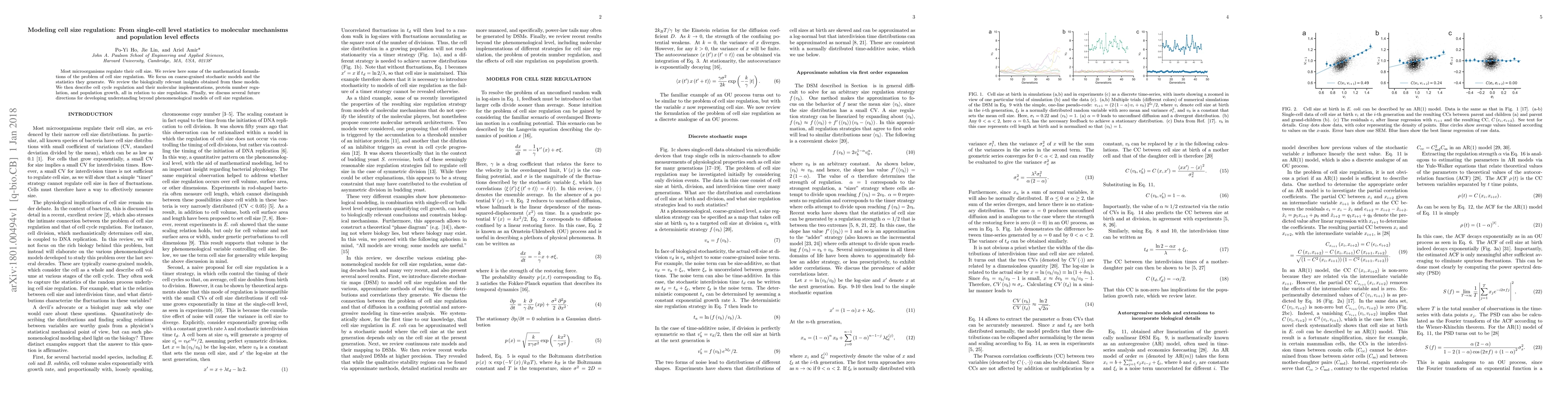 This paper reviews mathematical models of cell size regulation, focusing on coarse-grained stochastic models and their biological insights. It also discusses molecular mechanisms, protein number regulation, and population growth effects, concluding with future research directions beyond current models.