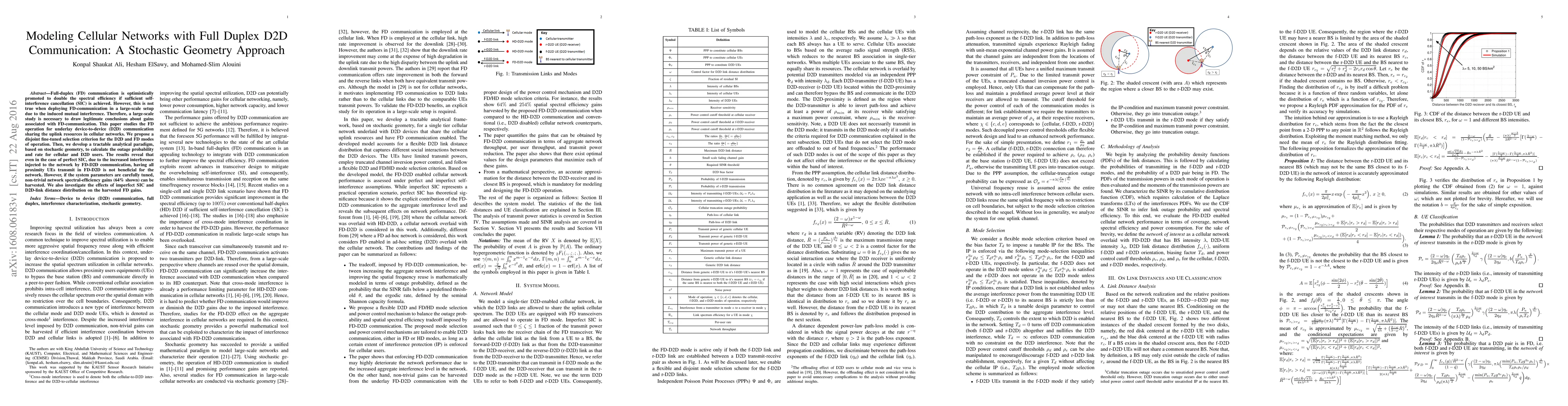This paper employs a stochastic geometry approach to model cellular networks with full-duplex D2D communication, finding that while full-duplex can theoretically double spectral efficiency, practical deployment leads to significant mutual interference. The study reveals that careful tuning of system parameters can yield non-trivial spectral efficiency gains despite the interference.