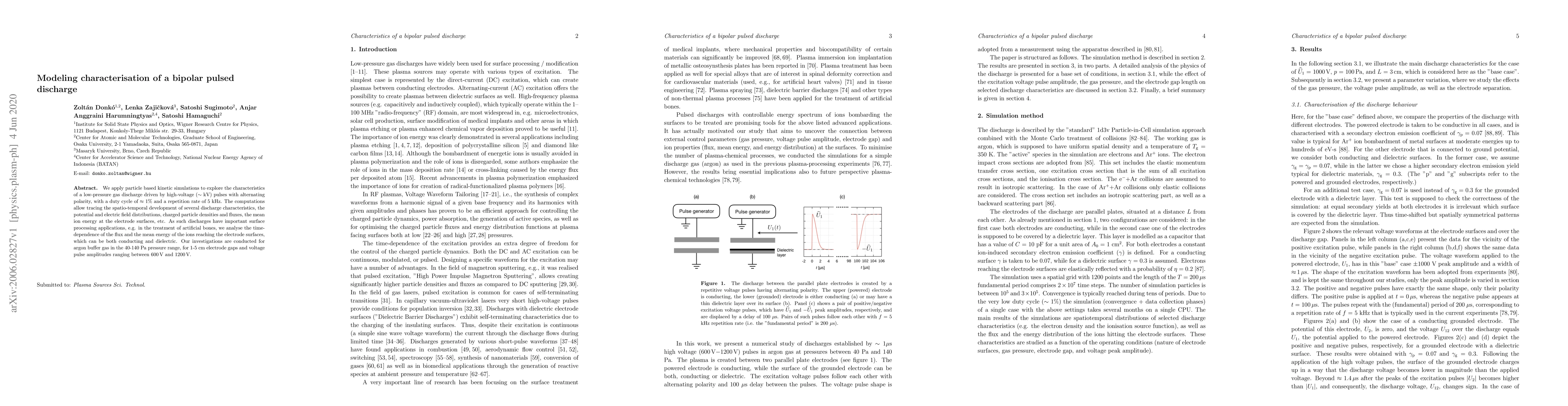 We apply particle based kinetic simulations to explore the characteristics of a low-pressure gas discharge driven by high-voltage ( $\sim$ kV) pulses with alternating polarity, with a duty cycle of $\approx$ 1% and a repetition rate of 5 kHz. The computations allow tracing the spatio-temporal development of several discharge characteristics, the potential and electric field distributions, charged particle densities and fluxes, the mean ion energy at the electrode surfaces, etc. As such discharges have important surface processing applications, e.g. in the treatment of artificial bones, we analyse the time-dependence of the flux and the mean energy of the ions reaching the electrode surfaces, which can be both conducting and dielectric. Our investigations are conducted for argon buffer gas in the 40-140 Pa pressure range, for 1-5 cm electrode gaps and voltage pulse amplitudes ranging between 600 V and 1200 V.