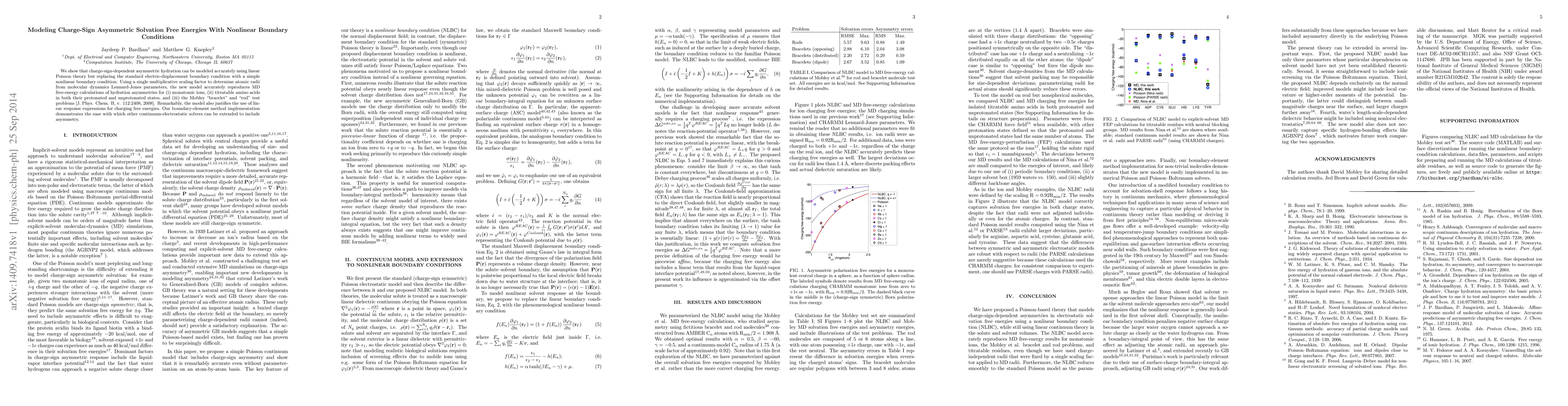 This paper presents a new model for charge-sign asymmetric solvation free energies using nonlinear boundary conditions instead of the standard linear electric-displacement boundary condition. The model accurately reproduces molecular dynamics simulations for various ions and amino acids, demonstrating its broad applicability.