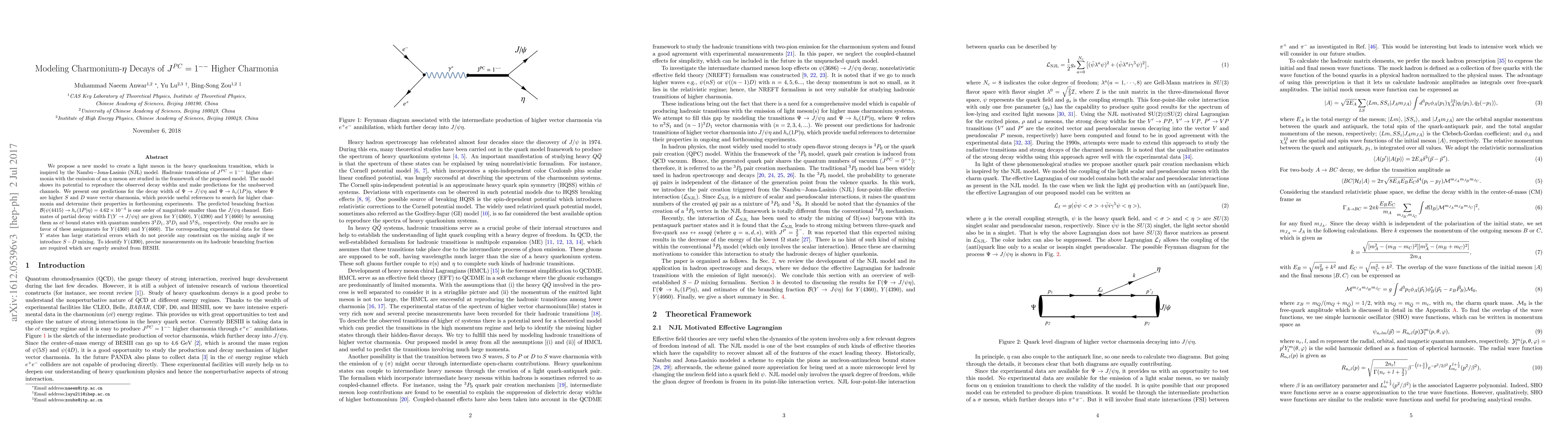 We propose a new model to create a light meson in the heavy quarkonium transition, which is inspired by the Nambu$-$Jona-Lasinio (NJL) model. Hadronic transitions of $J^{PC}=1^{--}$ higher charmonia with the emission of an $\eta$ meson are studied in the framework of the proposed model. The model shows its potential to reproduce the observed decay widths and make predictions for the unobserved channels. We present our predictions for the decay width of $\Psi \to J/\psi \eta$ and $\Psi \to h_{c}(1P)\eta$, where $\Psi$ are higher $S$ and $D$ wave vector charmonia, which provide useful references to search for higher charmonia and determine their properties in forthcoming experiments. The predicted branching fraction $\mathcal B(\psi(4415)\to h_{c}(1P)\eta)=4.62\times 10^{-4}$ is one order of magnitude smaller than the $J/\psi \eta$ channel. Estimates of partial decay width $\Gamma(Y \to J/\psi \eta)$ are given for $Y(4360)$, $Y(4390)$ and $Y(4660)$ by assuming them as $c\bar{c}$ bound states with quantum numbers $3 ^3D_1$, $3 ^3D_1$ and $5 ^3S_1$, respectively. Our results are in favor of these assignments for $Y(4360)$ and $Y(4660)$. The corresponding experimental data for these $Y$ states has large statistical errors which do not provide any constraint on the mixing angle if we introduce $S-D$ mixing. To identify $Y(4390)$, precise measurements on its hadronic branching fraction are required which are eagerly awaited from BESIII.