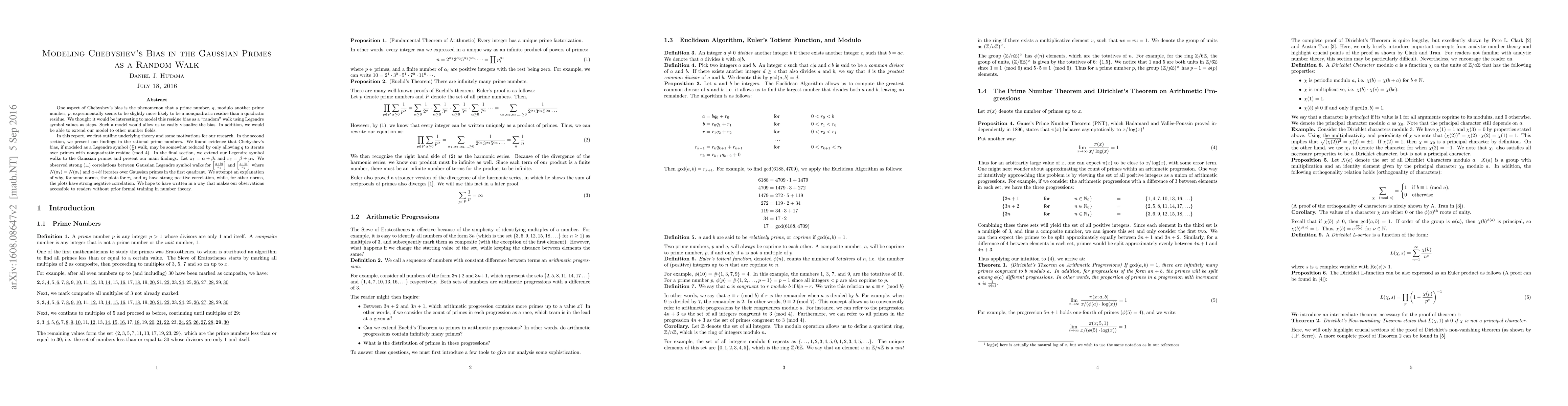 One aspect of Chebyshev's bias is the phenomenon that a prime number, $ q $, modulo another prime number, $ p$, experimentally seems to be slightly more likely to be a nonquadratic residue than a quadratic residue. We thought it would be interesting to model this residue bias as a "random" walk using Legendre symbol values as steps. Such a model would allow us to easily visualize the bias. In addition, we would be able to extend our model to other number fields. In this report, we first outline underlying theory and some motivations for our research. In the second section, we present our findings in the rational prime numbers. We found evidence that Chebyshev's bias, if modeled as a Legendre symbol $ \left(\frac{q}{p}\right)$ walk, may be somewhat reduced by only allowing $ q$ to iterate over primes with nonquadratic residue (mod $ 4$). In the final section, we extend our Legendre symbol walks to the Gaussian primes and present our main findings. Let $ \pi_1 = \alpha+\beta i$ and $ \pi_2 = \beta+\alpha i$. We observed strong ($ \pm$) correlations between Gaussian Legendre symbol walks for $ \left[\frac{a+bi}{\pi_1}\right]$ and $ \left[\frac{a+bi}{\pi_2}\right]$ where $ N(\pi_1) = N(\pi_2)$ and $ a+bi$ iterates over Gaussian primes in the first quadrant. We attempt an explanation of why, for some norms, the plots for $ \pi_1$ and $ \pi_2$ have strong positive correlation, while, for other norms, the plots have strong negative correlation. We hope to have written in a way that makes our observations accessible to readers without prior formal training in number theory.