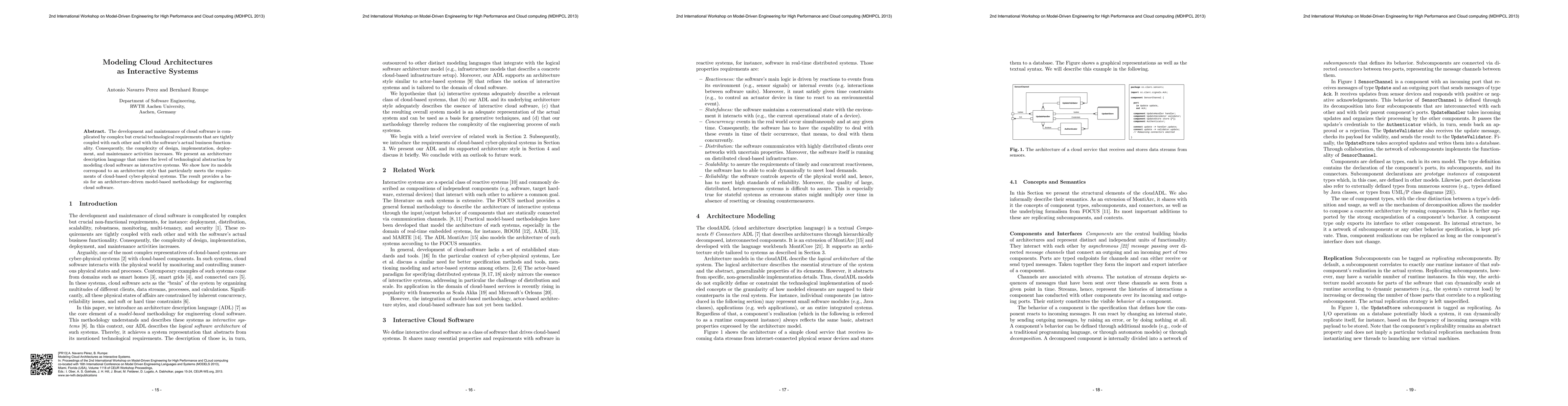 The development and maintenance of cloud software is complicated by complex but crucial technological requirements that are tightly coupled with each other and with the softwares actual business functionality. Consequently, the complexity of design, implementation, deployment, and maintenance activities increases. We present an architecture description language that raises the level of technological abstraction by modeling cloud software as interactive systems. We show how its models correspond to an architecture style that particularly meets the requirements of cloud-based cyber-physical systems. The result provides a basis for an architecture-driven model-based methodology for engineering cloud software.