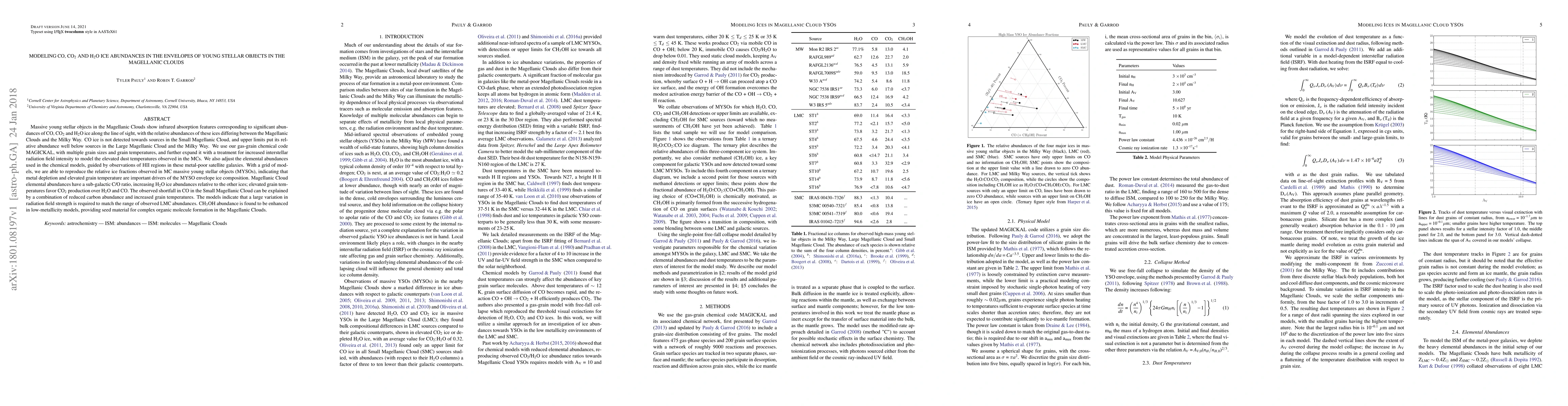 This study models the abundances of CO, CO$_2$, and H$_2$O ice in the envelopes of massive young stellar objects in the Magellanic Clouds using the chemical code MAGICKAL. The results show that metal depletion and elevated grain temperatures significantly influence the ice composition, with CO ice notably absent in the Small Magellanic Cloud due to lower carbon abundance and higher grain temperatures.