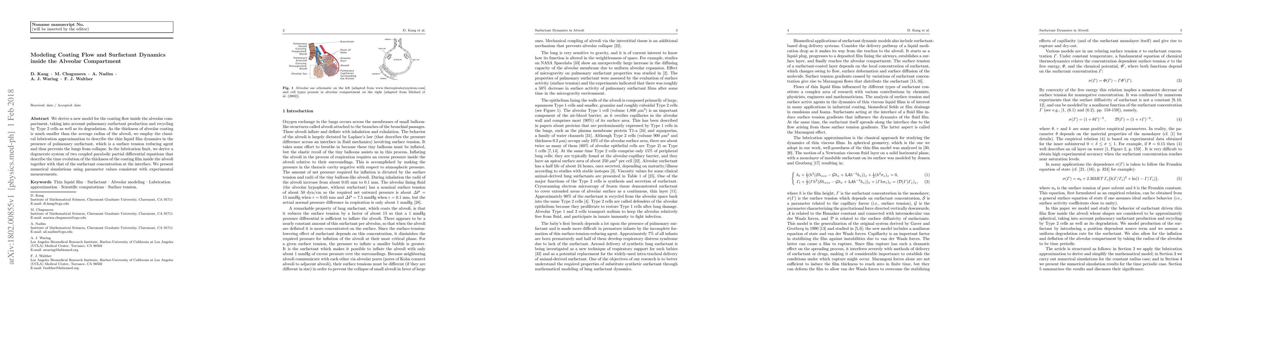 This paper develops a new model for coating flow in the alveolar compartment, incorporating surfactant dynamics and degradation. It uses the lubrication approximation to describe the thin liquid film, resulting in a system of two coupled partial differential equations for film thickness and surfactant concentration, validated through numerical simulations.