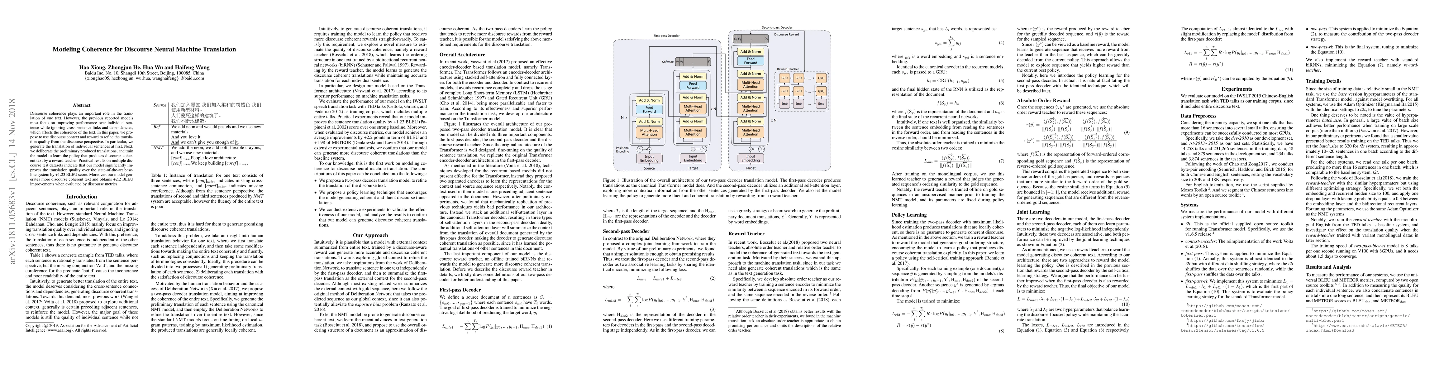 This paper proposes a neural machine translation model that enhances coherence across sentences by incorporating discourse context and rewards. It first translates individual sentences and then refines the translation to produce coherent text, achieving a +1.23 BLEU score improvement and +2.2 BLEU improvement in discourse metrics over the baseline.
