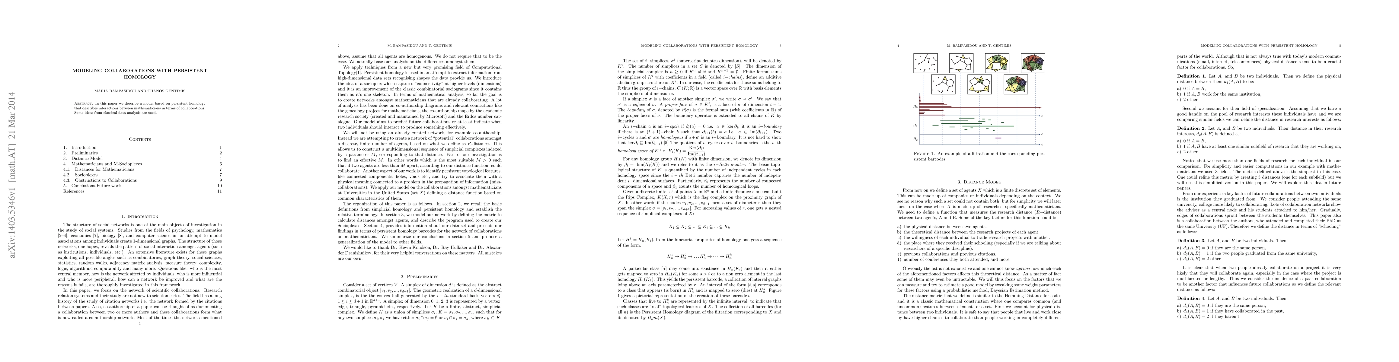In this paper we describe a model based on persistent homology that describes interactions between mathematicians in terms of collaborations. Some ideas from classical data analysis are used.