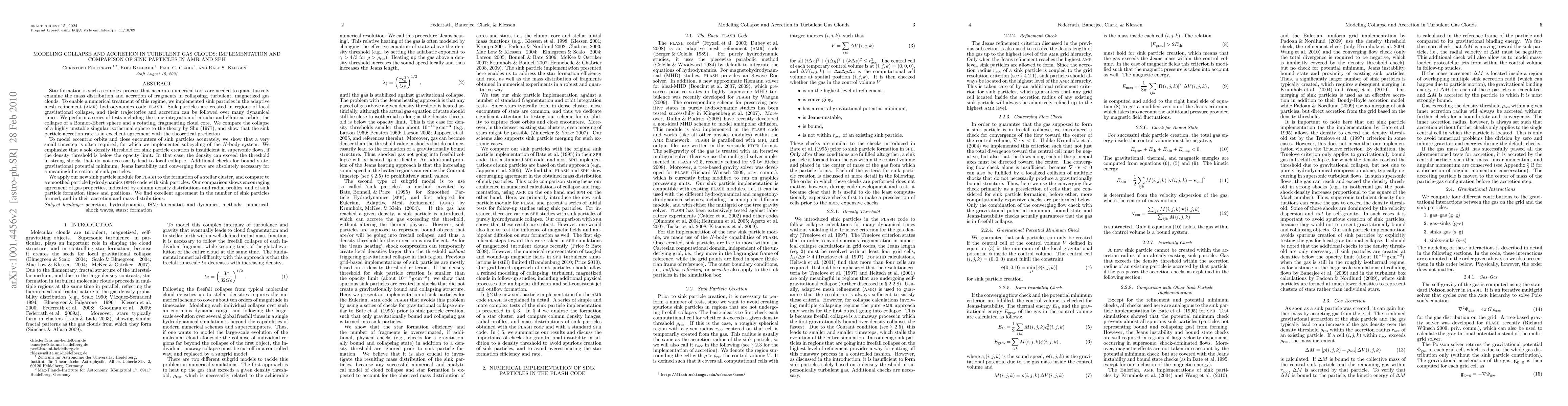 This paper implements and tests sink particles in the FLASH adaptive mesh refinement code to model gravitational collapse and accretion in turbulent gas clouds. It compares results with a smoothed particle hydrodynamics code, showing good agreement in gas properties and sink particle behavior, while emphasizing the necessity of additional checks beyond density thresholds for accurate sink particle creation.