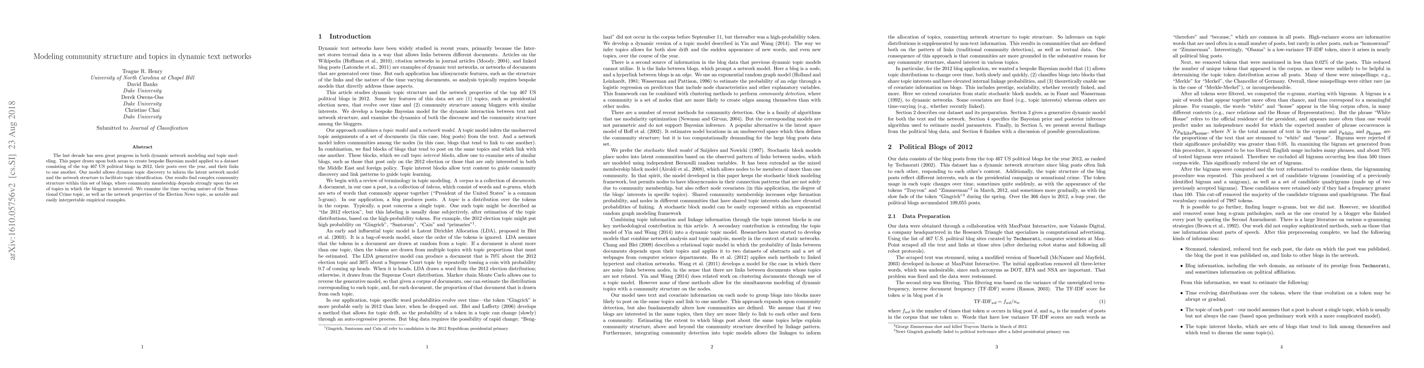 The last decade has seen great progress in both dynamic network modeling and topic modeling. This paper draws upon both areas to create a Bayesian method that allows topic discovery to inform the latent network model and the network structure to facilitate topic identification. We apply this method to the 467 top political blogs of 2012. Our results find complex community structure within this set of blogs, where community membership depends strongly upon the set of topics in which the blogger is interested.