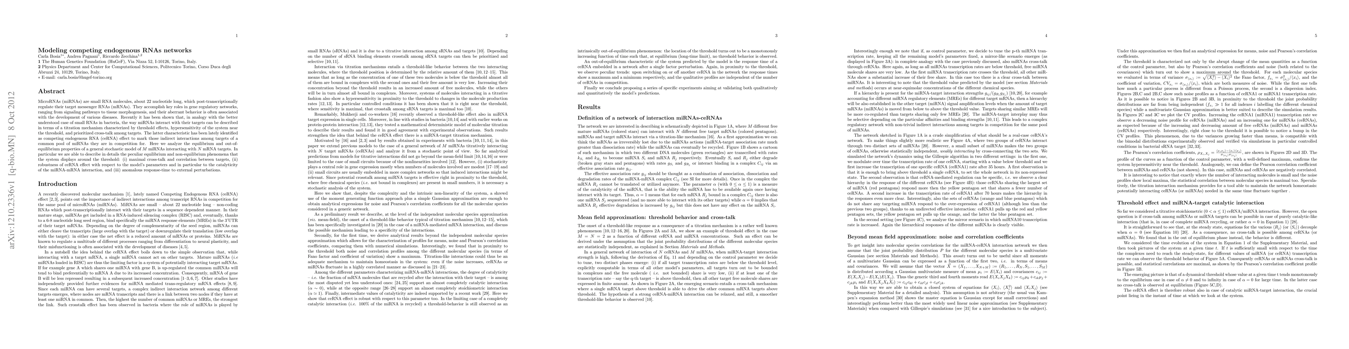 This paper models the interactions between microRNAs (miRNAs) and messenger RNAs (mRNAs) to describe competing endogenous RNA (ceRNA) networks. It reveals equilibrium and non-equilibrium phenomena, including maximal cross-talk, robustness of ceRNA effects, and anomalous response times near interaction thresholds.