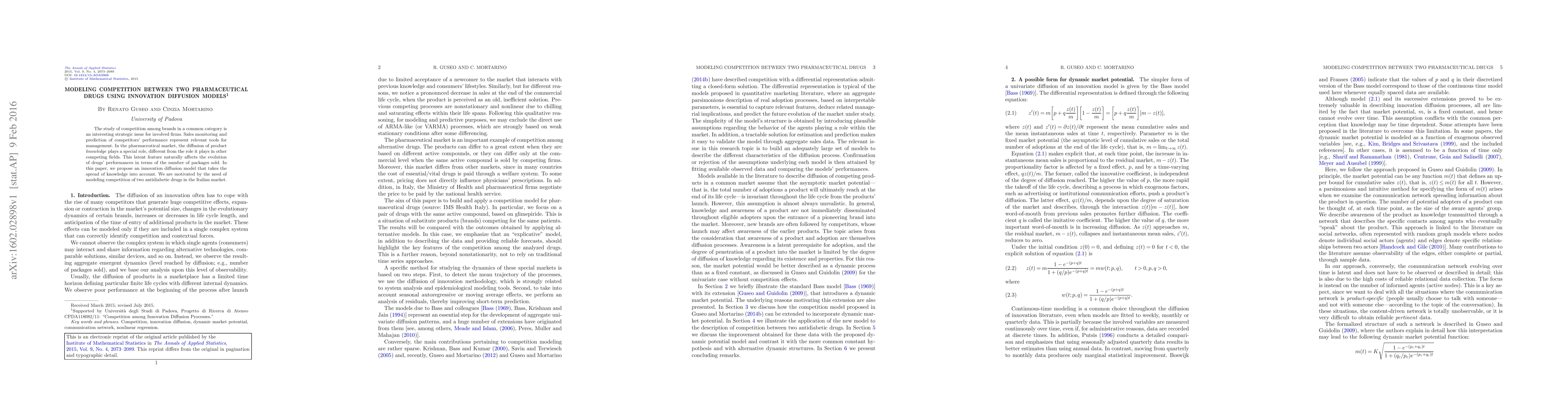 This paper proposes an innovation diffusion model to analyze competition between two antidiabetic drugs in the Italian market, focusing on the role of knowledge spread in influencing drug sales performance. The model aims to predict competitors' performance and assist management strategies.
