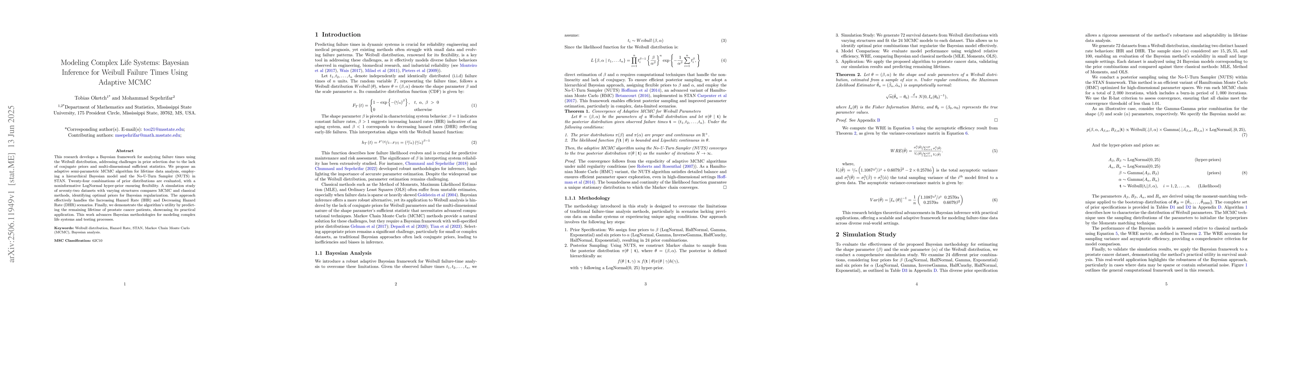 This research develops a Bayesian framework for analyzing failure times using the Weibull distribution, addressing challenges in prior selection due to the lack of conjugate priors and multi-dimensional sufficient statistics. We propose an adaptive semi-parametric MCMC algorithm for lifetime data analysis, employing a hierarchical Bayesian model and the No-U-Turn Sampler (NUTS) in STAN. Twenty-four combinations of prior distributions are evaluated, with a noninformative LogNormal hyper-prior ensuring flexibility. A simulation study of seventy-two datasets with varying structures compares MCMC and classical methods, identifying optimal priors for Bayesian regularization. The approach effectively handles the Increasing Hazard Rate (IHR) and Decreasing Hazard Rate (DHR) scenarios. Finally, we demonstrate the algorithm's utility by predicting the remaining lifetime of prostate cancer patients, showcasing its practical application. This work advances Bayesian methodologies for modeling complex life systems and testing processes.