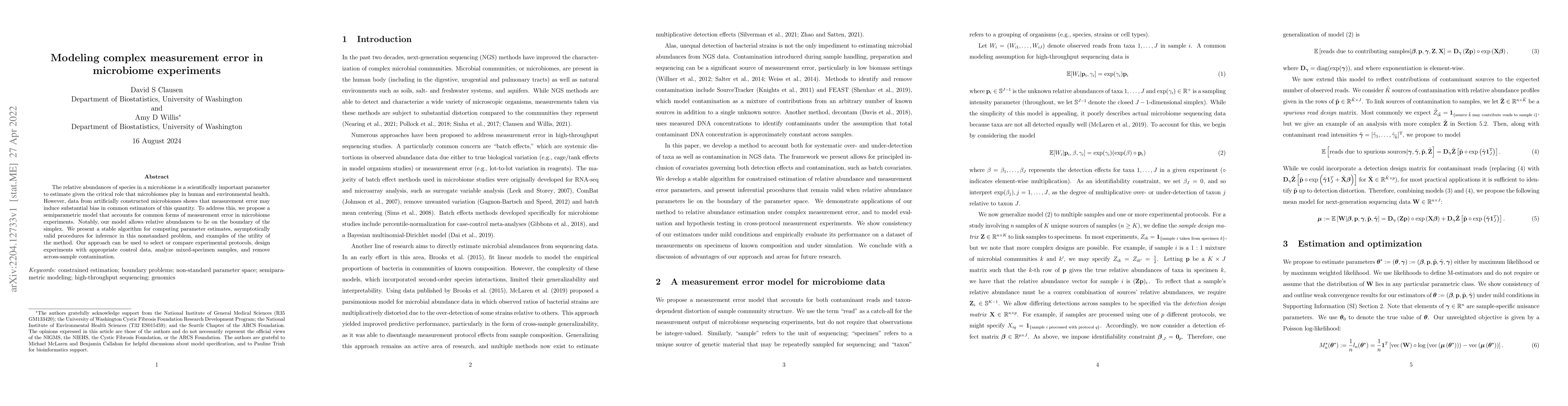 The relative abundances of species in a microbiome is a scientifically important parameter to estimate given the critical role that microbiomes play in human and environmental health. However, data from artificially constructed microbiomes shows that measurement error may induce substantial bias in common estimators of this quantity. To address this, we propose a semiparametric model that accounts for common forms of measurement error in microbiome experiments. Notably, our model allows relative abundances to lie on the boundary of the simplex. We present a stable algorithm for computing parameter estimates, asymptotically valid procedures for inference in this nonstandard problem, and examples of the utility of the method. Our approach can be used to select or compare experimental protocols, design experiments with appropriate control data, analyze mixed-specimen samples, and remove across-sample contamination.