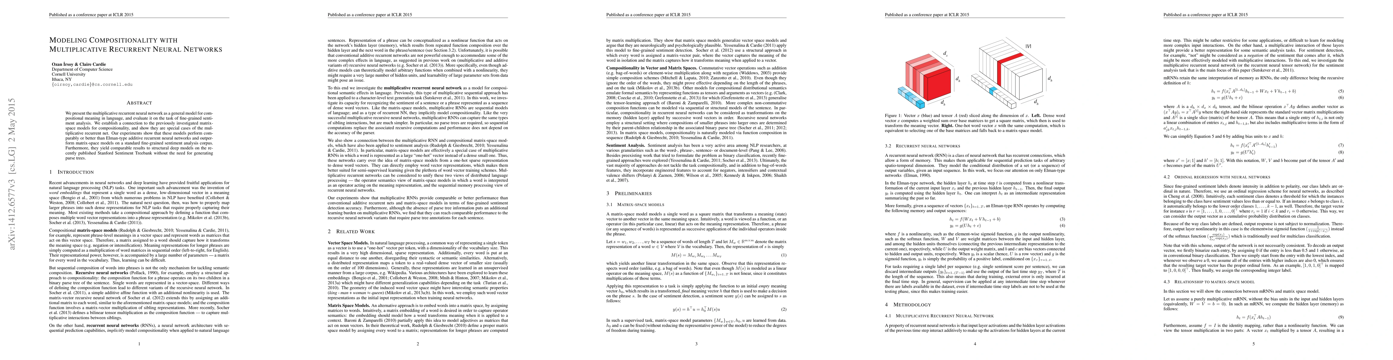 This paper introduces multiplicative recurrent neural networks as a general model for compositional meaning in language, demonstrating their effectiveness in fine-grained sentiment analysis. The models outperform traditional Elman-type networks and matrix-space models, and achieve results comparable to structural deep models without requiring parse trees.