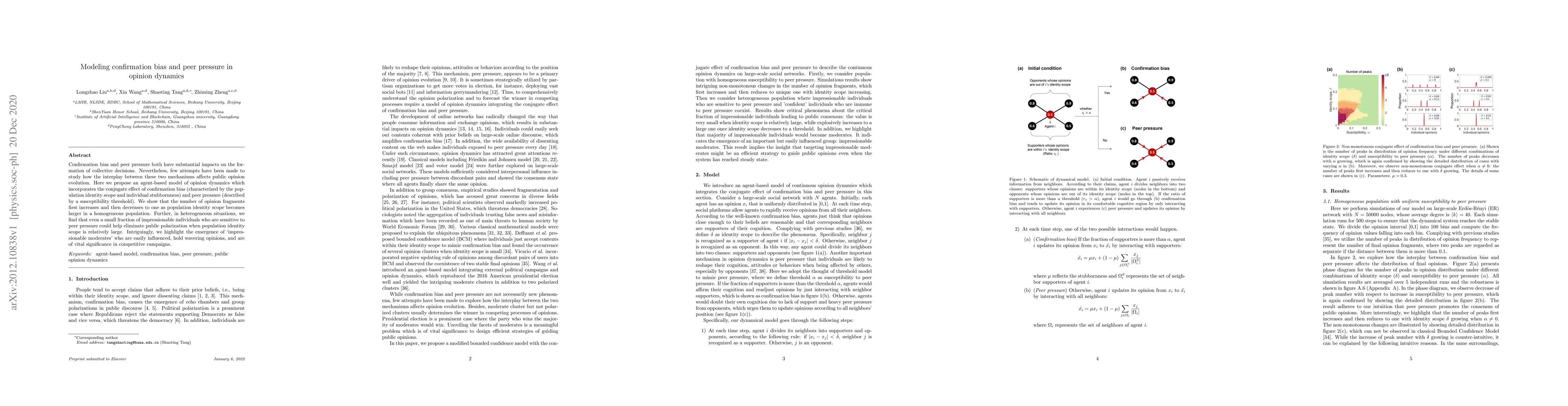 This paper proposes an agent-based model to study how confirmation bias and peer pressure interact to shape public opinion. It finds that larger population identity scopes initially increase opinion fragmentation but eventually lead to a single dominant opinion, while a small fraction of susceptible individuals can reduce polarization.