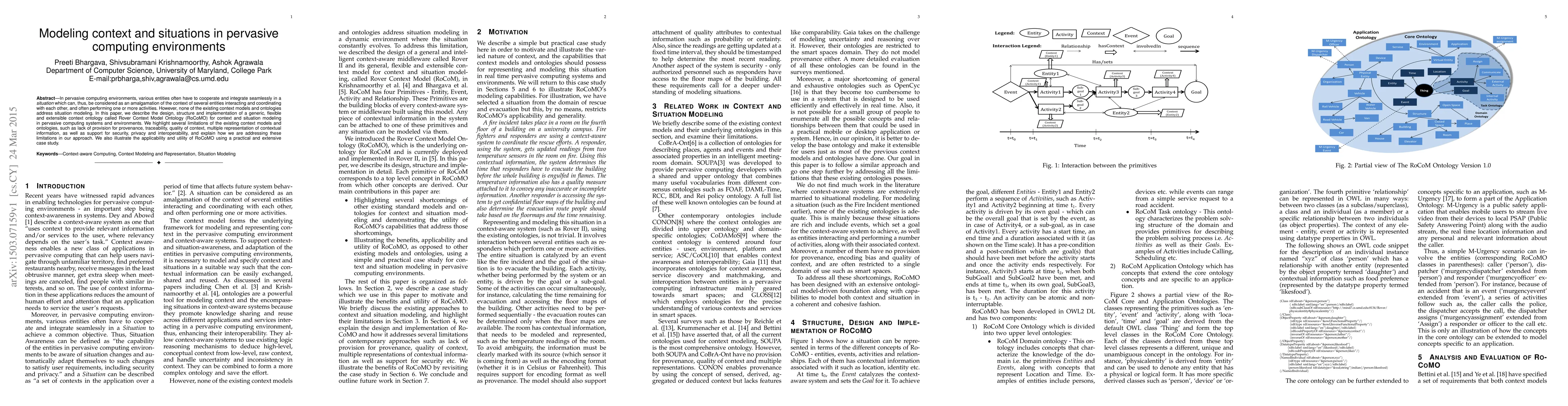 This paper introduces the Rover Context Model Ontology (RoCoMO) to address the limitations of existing context models in pervasive computing environments, focusing on context and situation modeling. It highlights improvements in provenance, traceability, quality, representation, security, privacy, and interoperability, and demonstrates its practical utility through a case study.