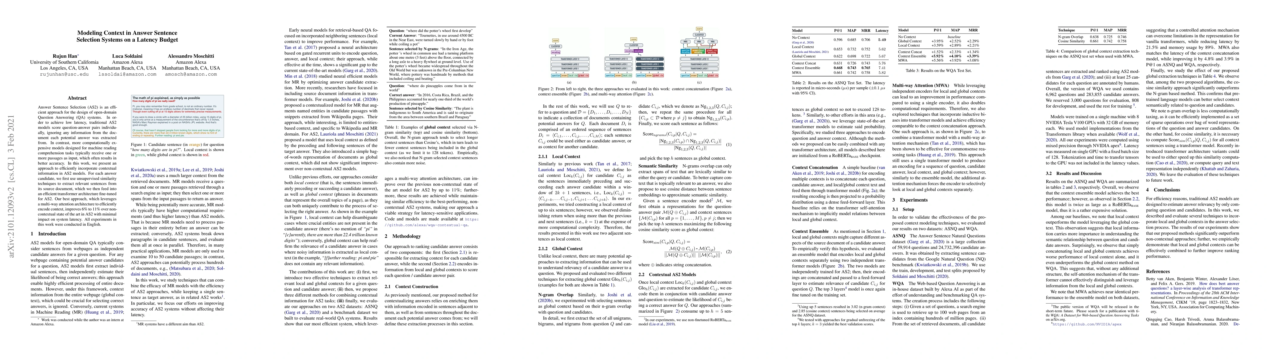 The paper presents an approach to efficiently incorporate contextual information in Answer Sentence Selection (AS2) models using unsupervised similarity techniques to extract relevant sentences from source documents, which are then fed into an efficient transformer architecture fine-tuned for AS2. The method considers both local context (sentences immediately preceding or succeeding an answer candidate) and global context (phrases in a document representing the overall topic of the page).