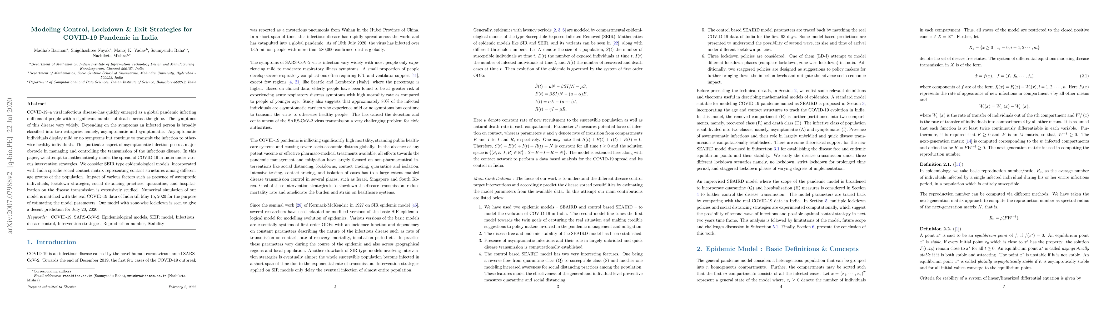This paper mathematically models the spread of COVID-19 in India using an SEIR type epidemiological model, incorporating India-specific social contact matrices. The study evaluates the impact of asymptomatic individuals, lockdown strategies, and other interventions on disease transmission, and matches model simulations with real data to predict future trends.