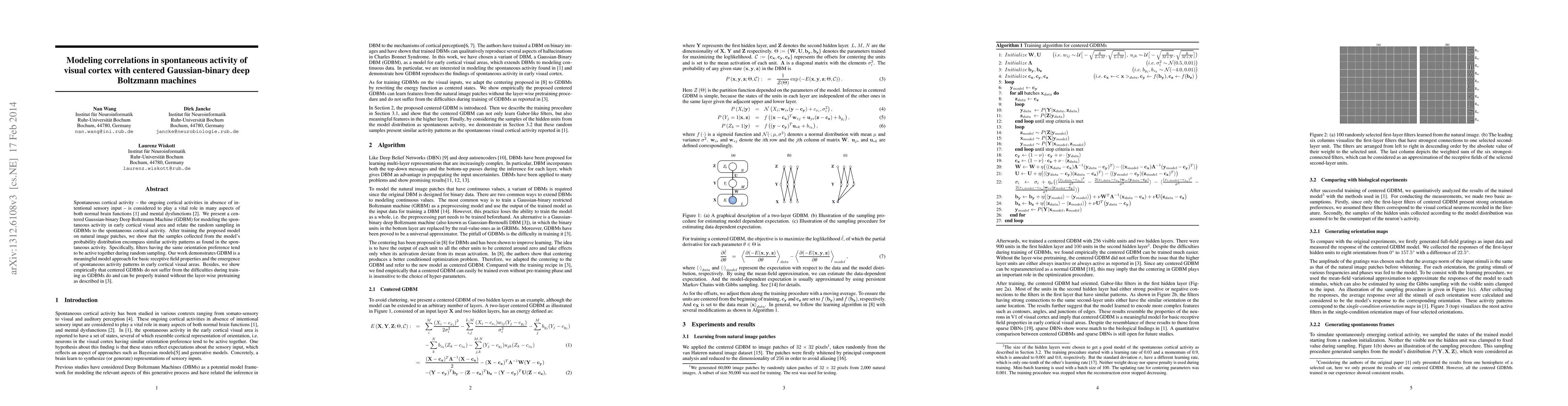This paper introduces a centered Gaussian-binary Deep Boltzmann Machine (GDBM) to model spontaneous activity in the visual cortex, demonstrating that the model's random samples reflect similar activity patterns to those observed in natural conditions. The study shows that the GDBM can be effectively trained without pretraining, unlike traditional GDBMs.