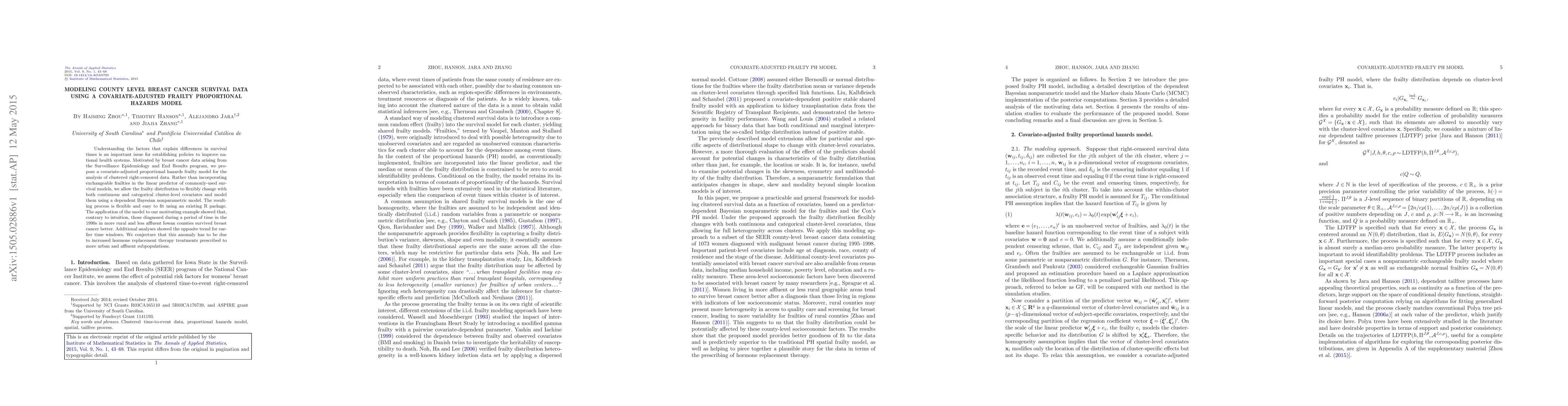 This paper proposes a covariate-adjusted frailty proportional hazards model to analyze county-level breast cancer survival data, revealing unexpected survival trends in rural versus urban areas in Iowa. The model's flexible Bayesian nonparametric approach identifies a survival advantage for rural patients in the 1990s, potentially linked to hormone replacement therapy trends.