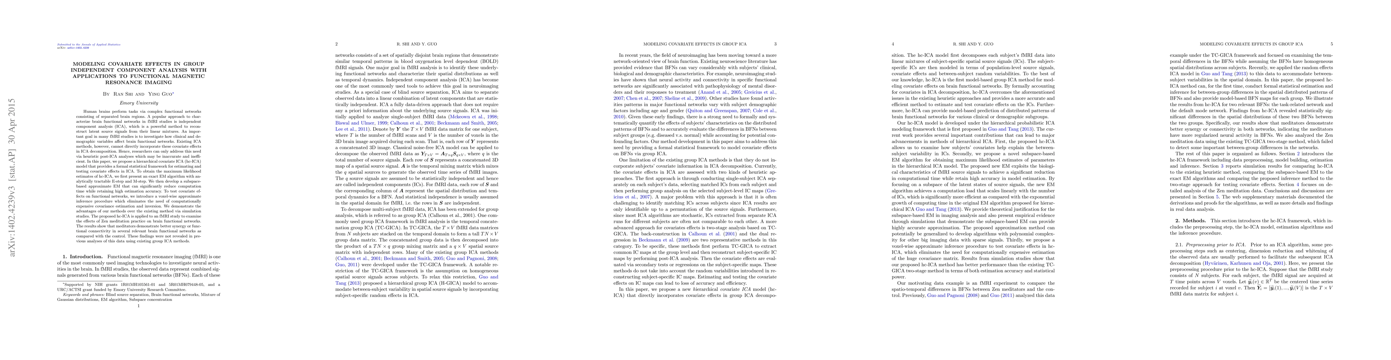 Independent component analysis (ICA) is a powerful computational tool for separating independent source signals from their linear mixtures. ICA has been widely applied in neuroimaging studies to identify and characterize underlying brain functional networks. An important goal in such studies is to assess the effects of subjects' clinical and demographic covariates on the spatial distributions of the functional networks. Currently, covariate effects are not incorporated in existing group ICA decomposition methods. Hence, they can only be evaluated through ad-hoc approaches which may not be accurate in many cases. In this paper, we propose a hierarchical covariate ICA model that provides a formal statistical framework for estimating and testing covariate effects in ICA decomposition. A maximum likelihood method is proposed for estimating the covariate ICA model. We develop two expectation-maximization (EM) algorithms to obtain maximum likelihood estimates. The first is an exact EM algorithm, which has analytically tractable E-step and M-step. Additionally, we propose a subspace-based approximate EM, which can significantly reduce computational time while still retain high model-fitting accuracy. Furthermore, to test covariate effects on the functional networks, we develop a voxel-wise approximate inference procedure which eliminates the needs of computationally expensive covariance estimation. The performance of the proposed methods is evaluated via simulation studies. The application is illustrated through an fMRI study of Zen meditation.