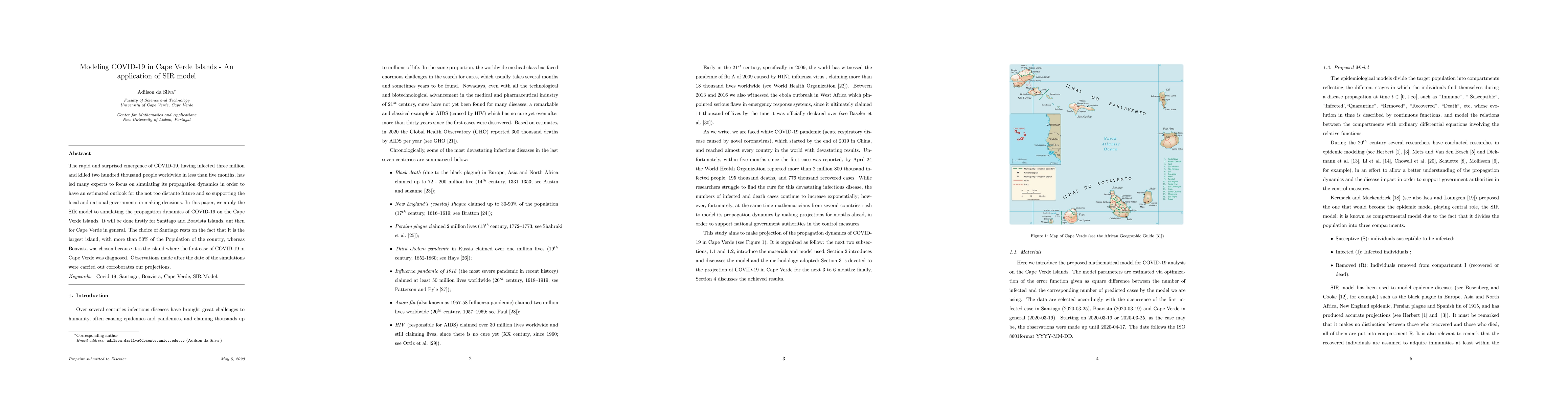 The rapid and surprised emergence of COVID-19, having infected three million and killed two hundred thousand people worldwide in less than five months, has led many experts to focus on simulating its propagation dynamics in order to have an estimated outlook for the not too distante future and so supporting the local and national governments in making decisions. In this paper, we apply the SIR model to simulating the propagation dynamics of COVID-19 on the Cape Verde Islands. It will be done firstly for Santiago and Boavista Islands, ant then for Cape Verde in general. The choice of Santiago rests on the fact that it is the largest island, with more than 50% of the Population of the country, whereas Boavista was chosen because it is the island where the first case of COVID-19 in Cape Verde was diagnosed. Observations made after the date of the simulations were carried out corroborates our projections.
