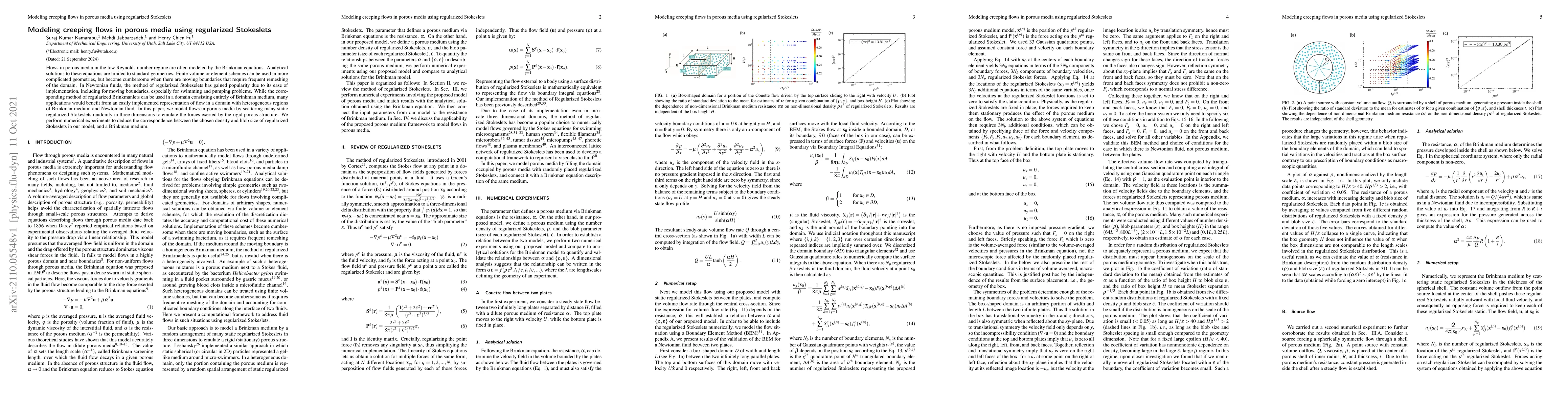 This paper proposes a method using scattered regularized Stokeslets to model creeping flows in porous media, addressing the limitations of traditional finite volume or element methods. The approach aims to simulate heterogeneous regions of Brinkman medium and Newtonian fluid, facilitating easier implementation for moving boundaries.