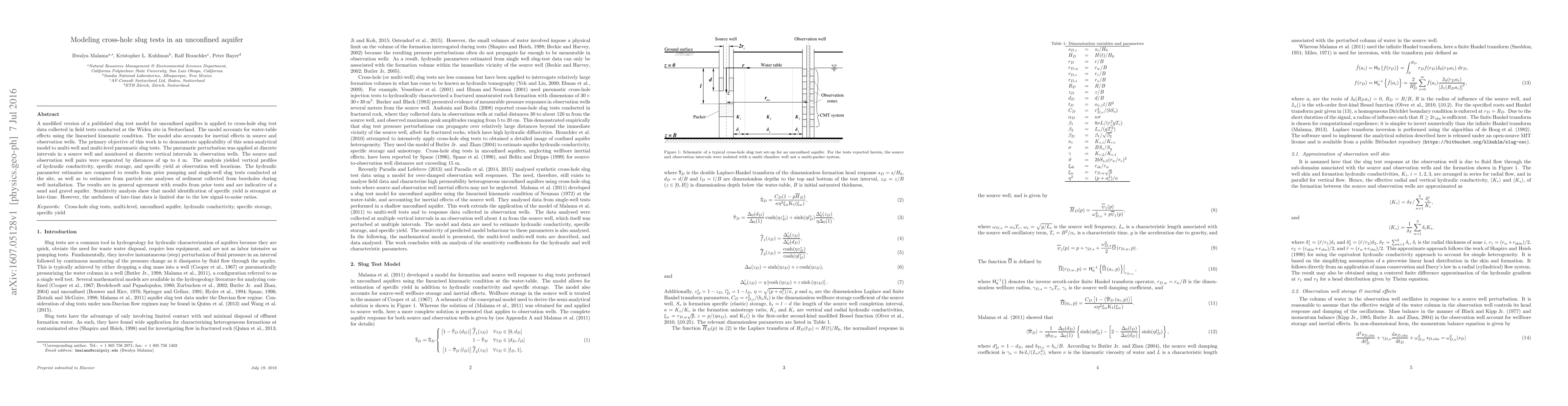 A modified version of a published slug test model for unconfined aquifers is applied to cross-hole slug test data collected in field tests conducted at the Widen site in Switzerland. The model accounts for water-table effects using the linearised kinematic condition. The model also accounts for inertial effects in source and observation wells. The primary objective of this work is to demonstrate applicability of this semi-analytical model to multi-well and multi-level pneumatic slug tests. The pneumatic perturbation was applied at discrete intervals in a source well and monitored at discrete vertical intervals in observation wells. The source and observation well pairs were separated by distances of up to 4 m. The analysis yielded vertical profiles of hydraulic conductivity, specific storage, and specific yield at observation well locations. The hydraulic parameter estimates are compared to results from prior pumping and single-well slug tests conducted at the site, as well as to estimates from particle size analyses of sediment collected from boreholes during well installation. The results are in general agreement with results from prior tests and are indicative of a sand and gravel aquifer. Sensitivity analysis show that model identification of specific yield is strongest at late-time. However, the usefulness of late-time data is limited due to the low signal-to-noise ratios.