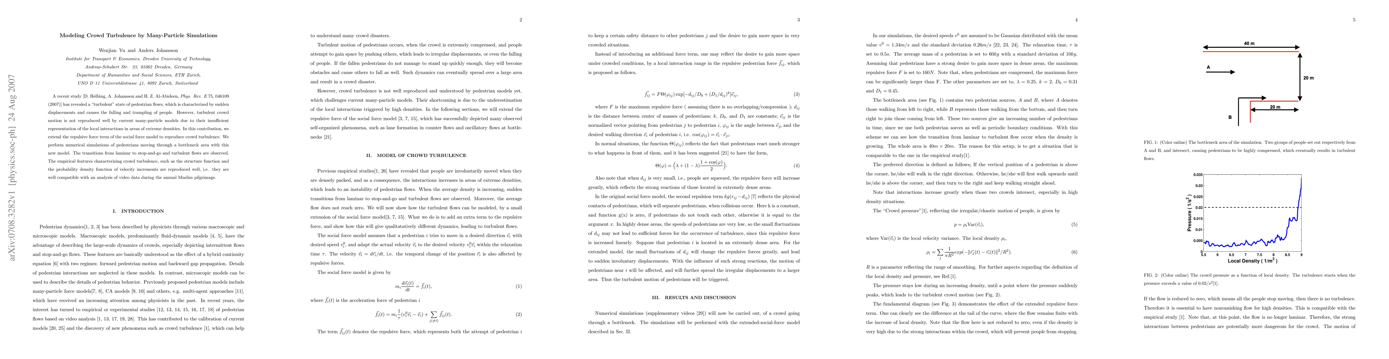 A recent study [D. Helbing, A. Johansson and H. Z. Al-Abideen, {\it Phys. Rev. E} 75, 046109 (2007)] has revealed a "turbulent" state of pedestrian flows, which is characterized by sudden displacements and causes the falling and trampling of people. However, turbulent crowd motion is not reproduced well by current many-particle models due to their insufficient representation of the local interactions in areas of extreme densities. In this contribution, we extend the repulsive force term of the social force model to reproduce crowd turbulence. We perform numerical simulations of pedestrians moving through a bottleneck area with this new model. The transitions from laminar to stop-and-go and turbulent flows are observed. The empirical features characterizing crowd turbulence, such as the structure function and the probability density function of velocity increments are reproduced well, i.e. they are well compatible with an analysis of video data during the annual Muslim pilgrimage.