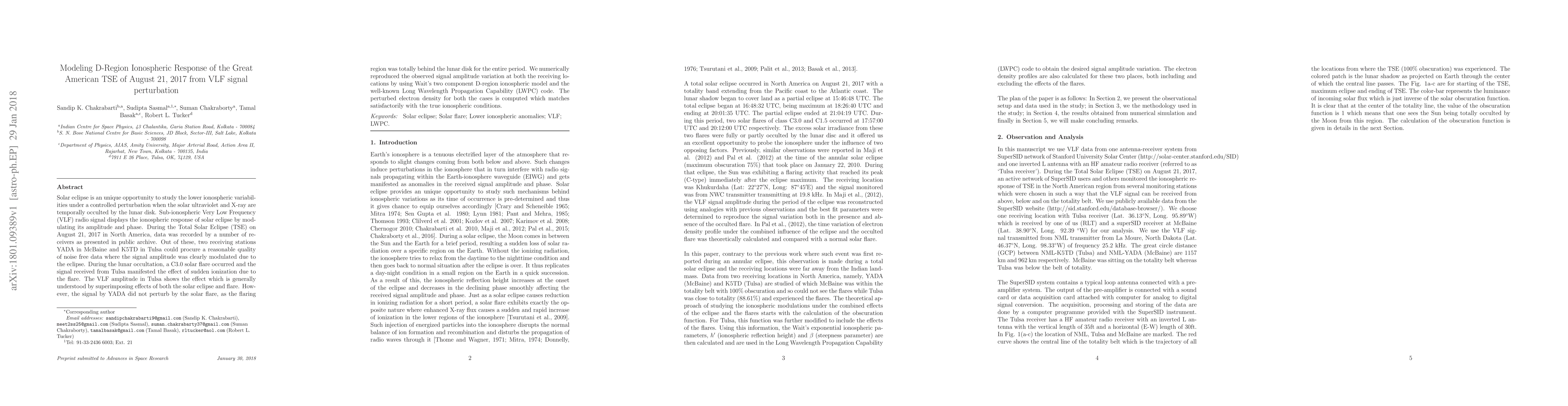 This paper models the ionospheric D-region response during the 2017 Great American Total Solar Eclipse using VLF signal perturbations, showing modulation in signal amplitude from two receiving stations. The Tulsa station's signal was additionally affected by a concurrent solar flare, while the McBaine station's signal was not, allowing for a comparative analysis using Wait's model and the LWPC code.