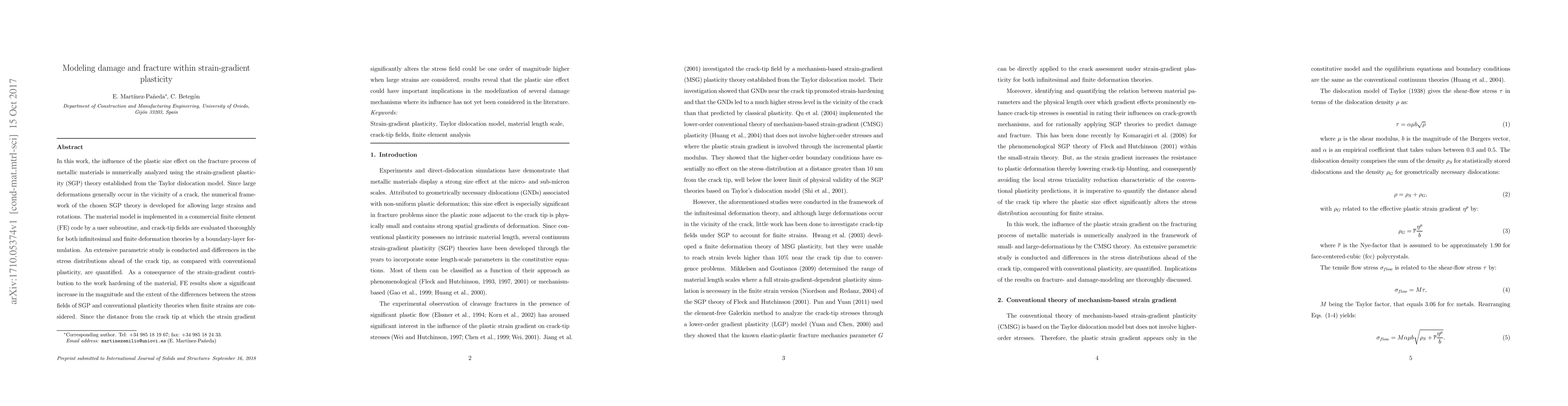This paper investigates the plastic size effect on fracture in metallic materials using strain-gradient plasticity theory, showing significant differences in stress distributions compared to conventional plasticity, especially under large strains. The findings suggest that strain gradients can notably influence damage mechanisms in materials.