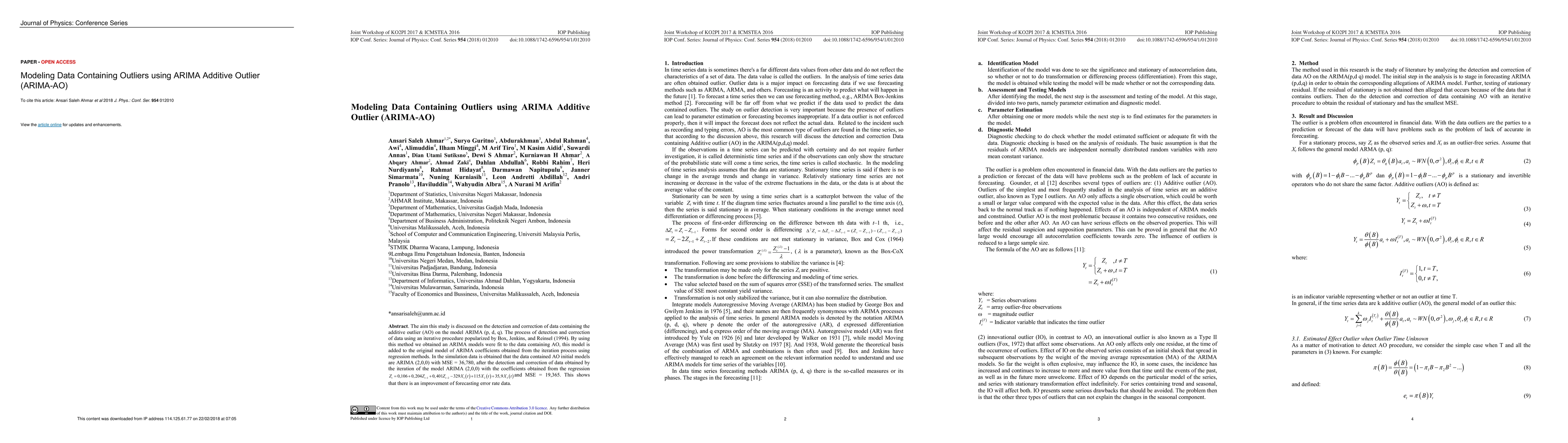 The aim this study is discussed on the detection and correction of data containing the additive outlier (AO) on the model ARIMA (p, d, q). The process of detection and correction of data using an iterative procedure popularized by Box, Jenkins, and Reinsel (1994). By using this method we obtained an ARIMA models were fit to the data containing AO, this model is added to the original model of ARIMA coefficients obtained from the iteration process using regression methods. This shows that there is an improvement of forecasting error rate data.