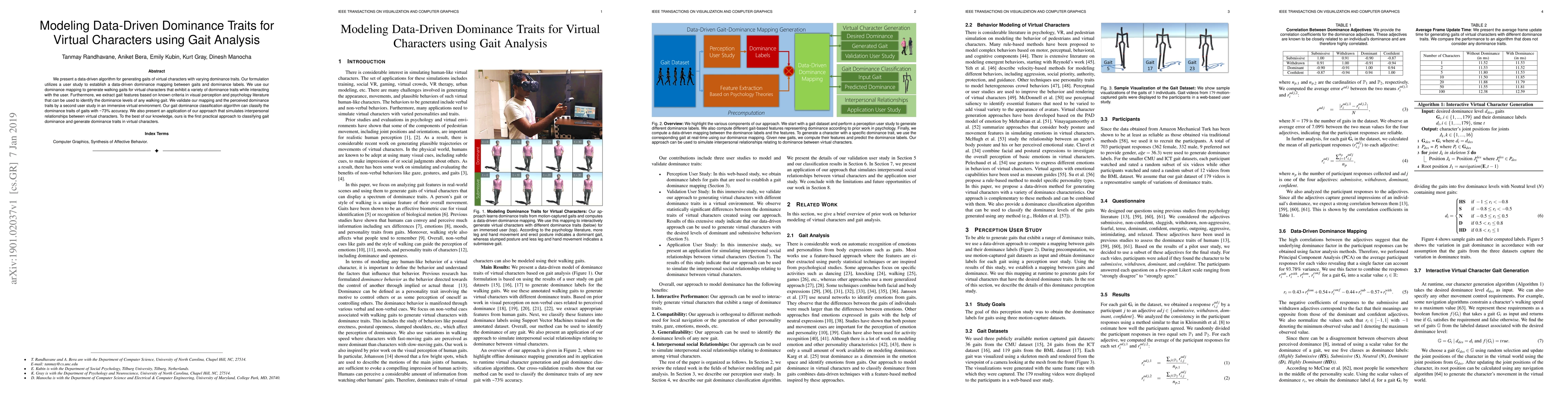 This paper introduces a data-driven algorithm to generate virtual characters' gaits that reflect varying dominance traits, validated through user studies. It classifies dominance traits with ~73% accuracy and applies the method to simulate interpersonal relationships in virtual environments.