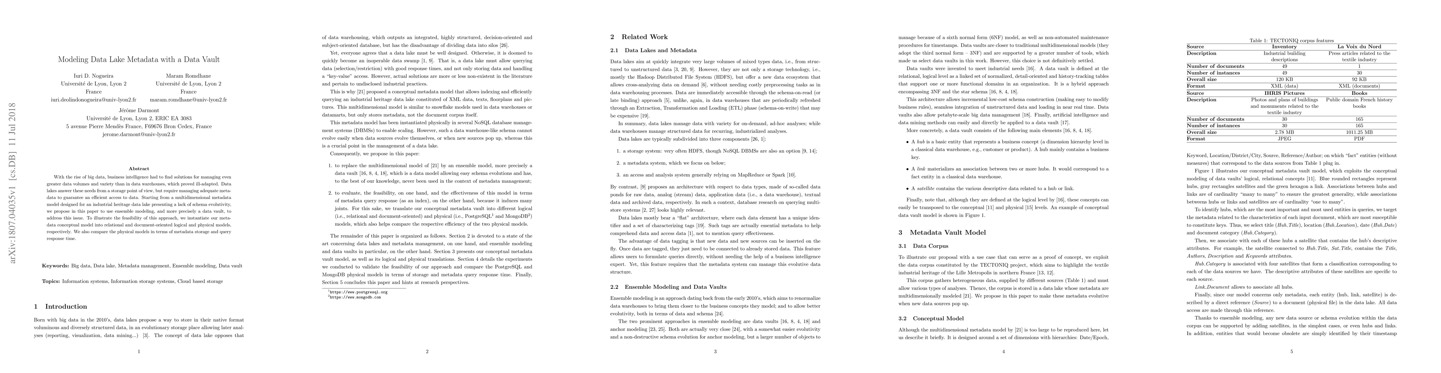 This paper proposes using a Data Vault modeling approach to enhance metadata management in data lakes, addressing the lack of schema evolutivity in existing models. The authors demonstrate the approach by instantiating their metadata model into relational and document-oriented databases and compare the performance of these models in terms of storage and query response time.