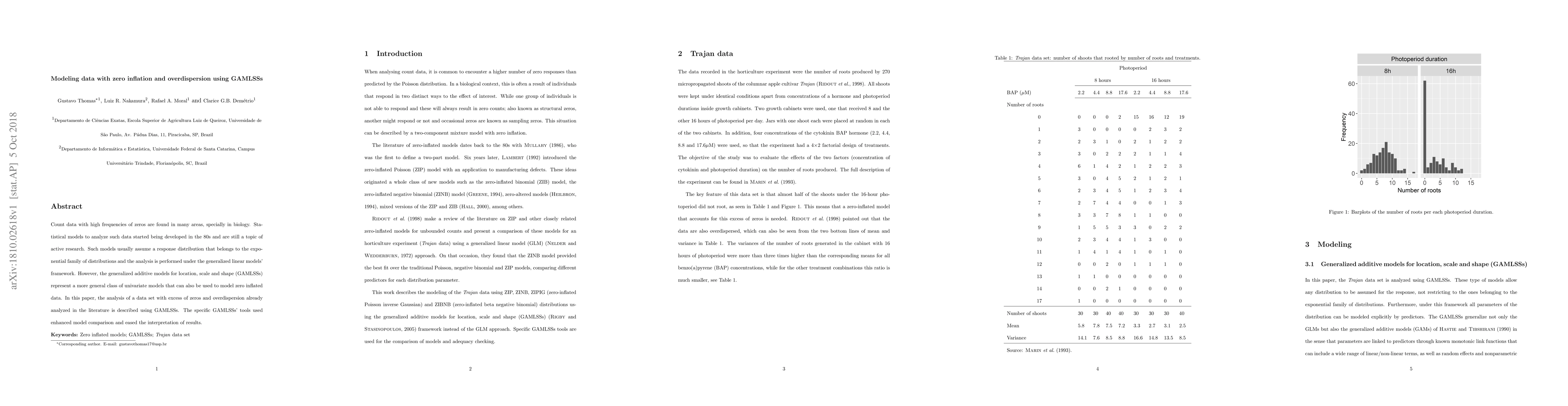 This paper explores the use of generalized additive models for location, scale and shape (GAMLSSSs) to model count data with high frequencies of zeros and overdispersion, offering enhanced model comparison and interpretation over traditional methods. The analysis demonstrates the effectiveness of GAMLSSs in handling such complex data structures.