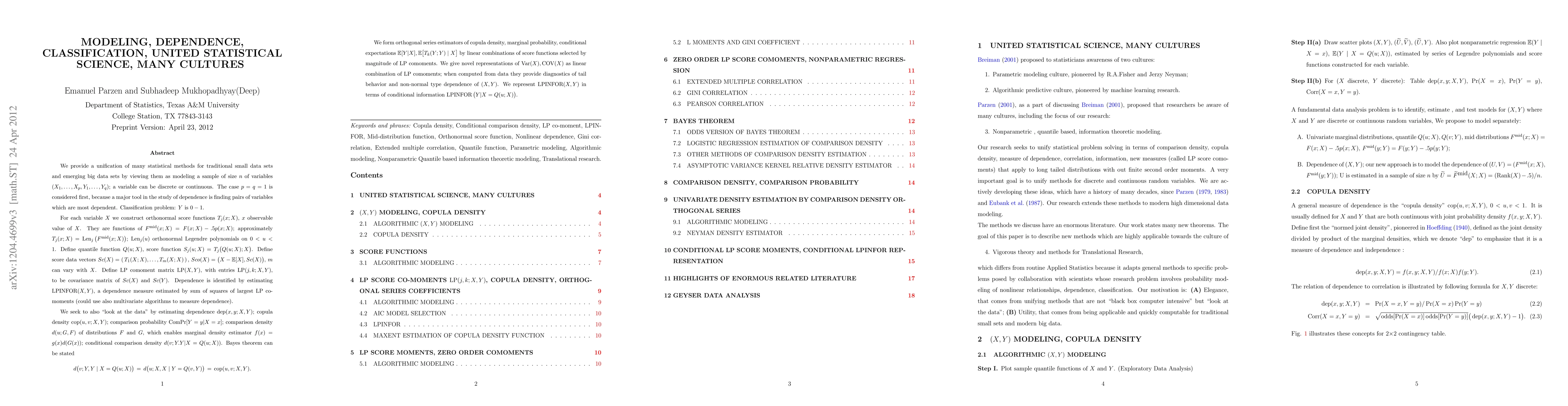 Breiman (2001) proposed to statisticians awareness of two cultures: 1. Parametric modeling culture, pioneered by R.A.Fisher and Jerzy Neyman; 2. Algorithmic predictive culture, pioneered by machine learning research. Parzen (2001), as a part of discussing Breiman (2001), proposed that researchers be aware of many cultures, including the focus of our research: 3. Nonparametric, quantile based, information theoretic modeling. We provide a unification of many statistical methods for traditional small data sets and emerging big data sets in terms of comparison density, copula density, measure of dependence, correlation, information, new measures (called LP score comoments) that apply to long tailed distributions with out finite second order moments. A very important goal is to unify methods for discrete and continuous random variables. Our research extends these methods to modern high dimensional data modeling.